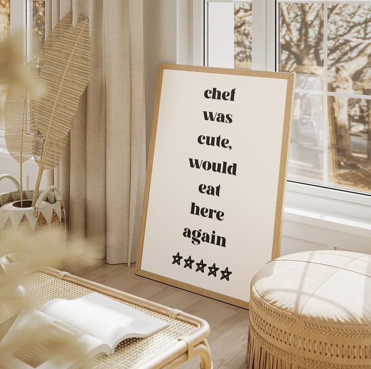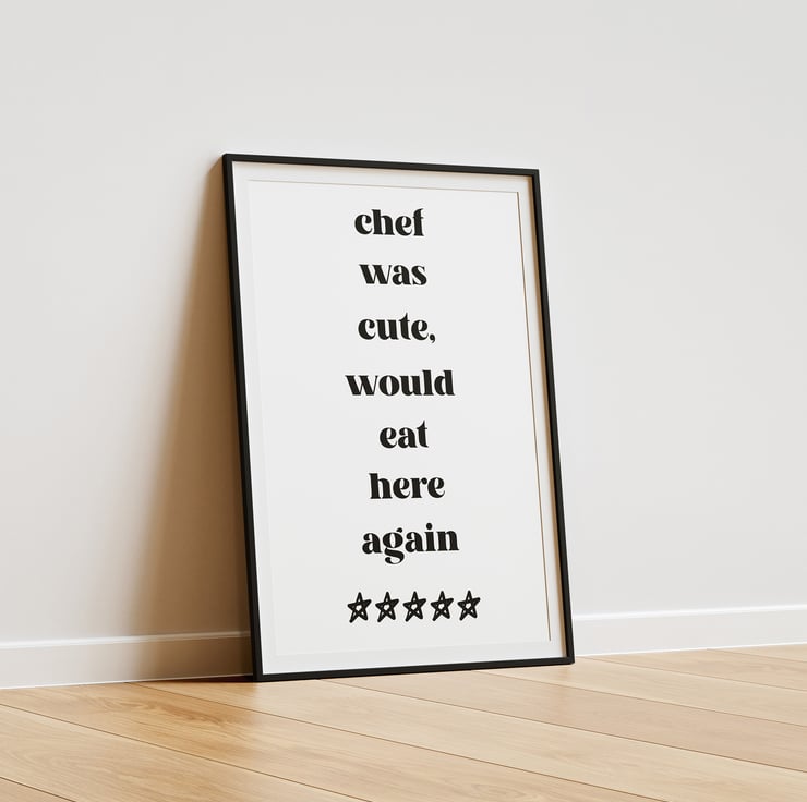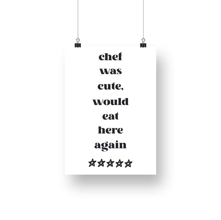This delightful print is a must-have for any foodie's décor collection. Featuring the quote "Chef is cute, would eat here again", it's sure to bring a smile to your face every time you enter your kitchen.