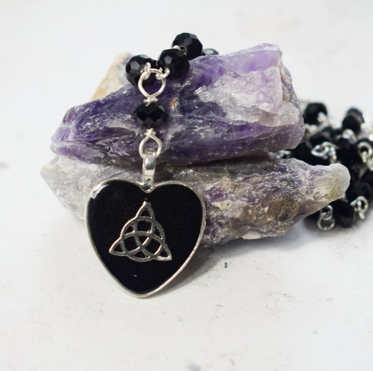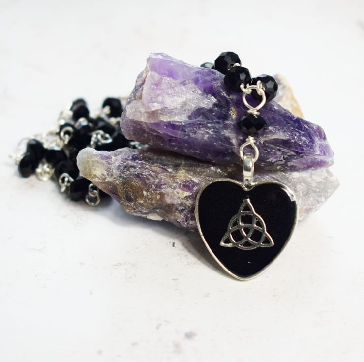 This lovely triquetra or trinity knot necklace has one of my favourite combinations, black and silver! They always look so beautiful together and even with a beaded necklace like this there is still a feeling of simplicity and clean lines making this necklace special enough for nights out but also perfect for everyday wear too!