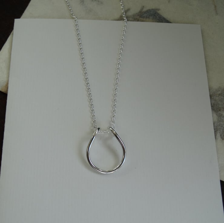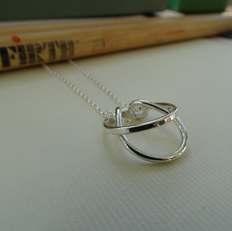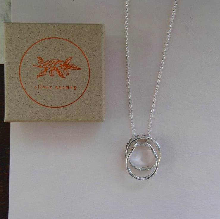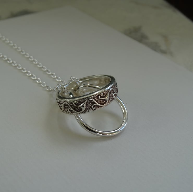 The design means that you don't need to fiddle around taking the chain on and off. Simply take hold of the pendant while it is round your neck, slip your ring over one of the pendant's arms, pull the ring along and up the other side of the pendant, and then drop it down - your ring will be held perfectly safe - demo in stories on my Instagram (at silver underscore nutmeg)