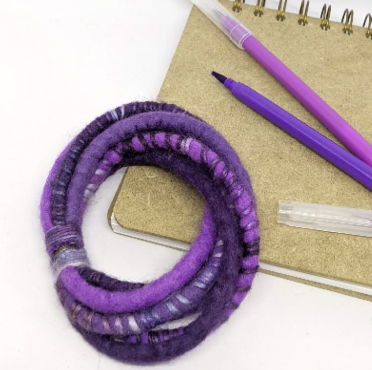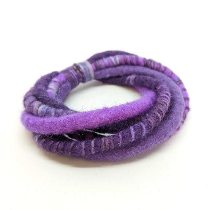 This handmade wet felted bangle twists together felted cords of soft merino wool in shades of deep lilac, purple and violet, wrapped with a toning lustrous merino and silk blend yarn. It closes with a strong magnetic fastening.