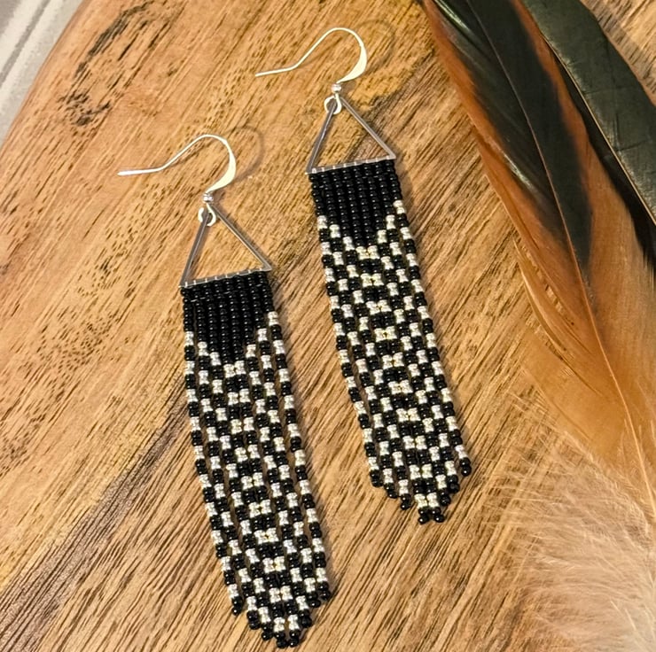 These long beaded earrings are handmade with small Miyuki glass seed beads. The black beads have been hand woven onto a silver triangle, then forming a long beaded fringe they follow an alternating pattern of black and silver.