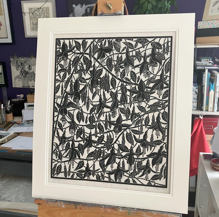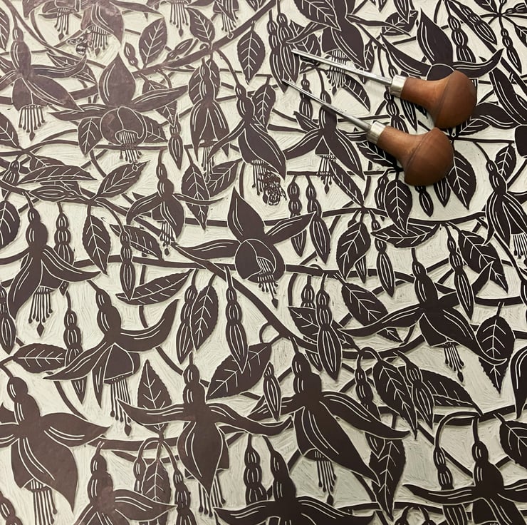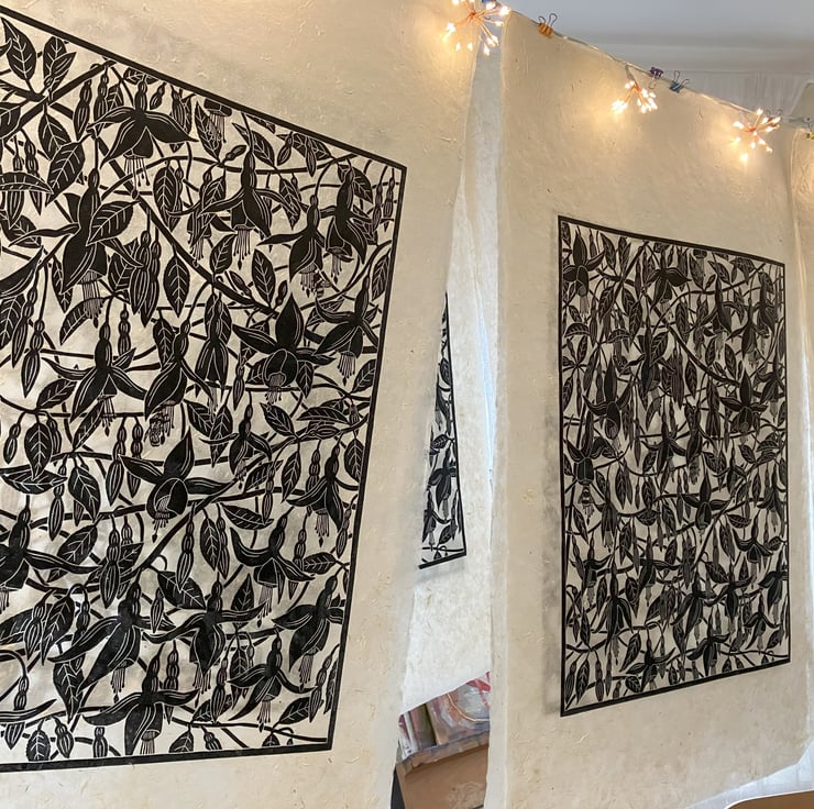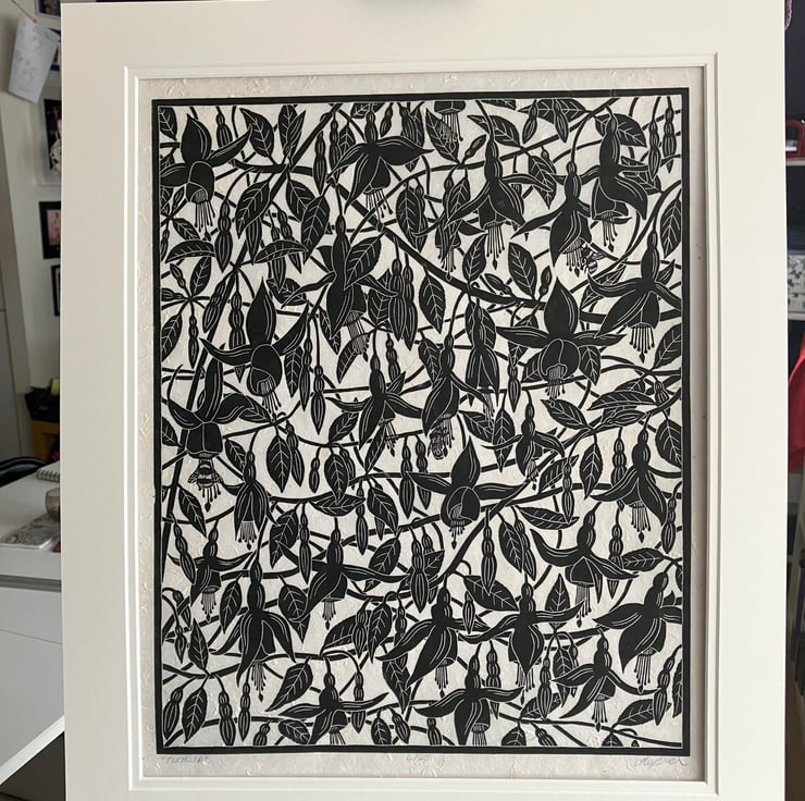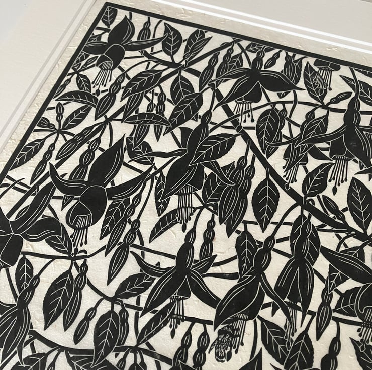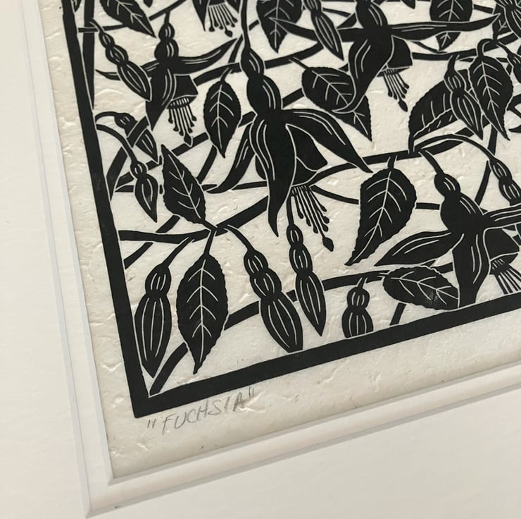"Fuchsia" is created using the linocut printing process. Linocut is a relief printmaking method where an image is transferred or drawn directly in reverse onto the lino block. The image is then carved into the surface of the lino using mainly U and V shaped gouges. Ink is then applied to the block, paper laid onto the surface and hand burnished. Each print is created by hand so there may be tiny variations which add to the individual beauty of these original artworks. "Fuchsia" is printed onto 30gsm Nepalese Lokta Paper which is textured handmade paper.