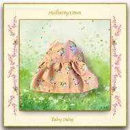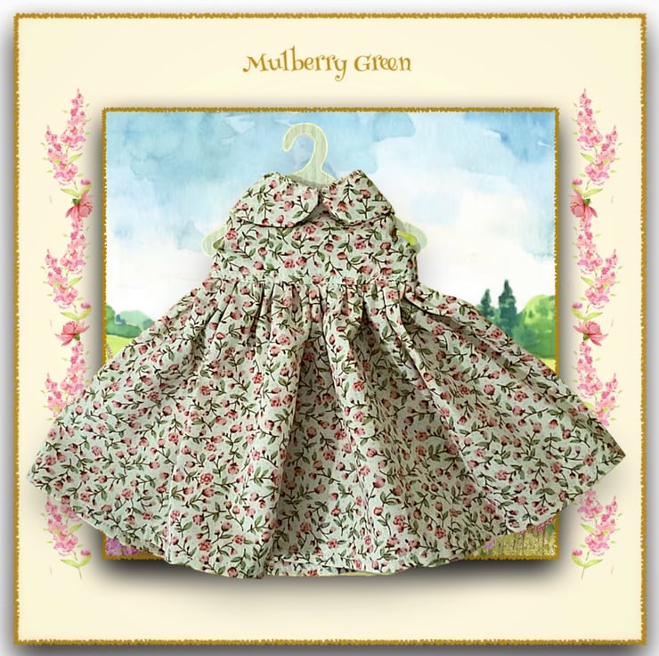 A pretty little dress in an ivory and pink sprig print, to fit the Mulberry Green characters. The dress is made from cotton and has a Peter Pan collar and a lined bodice.