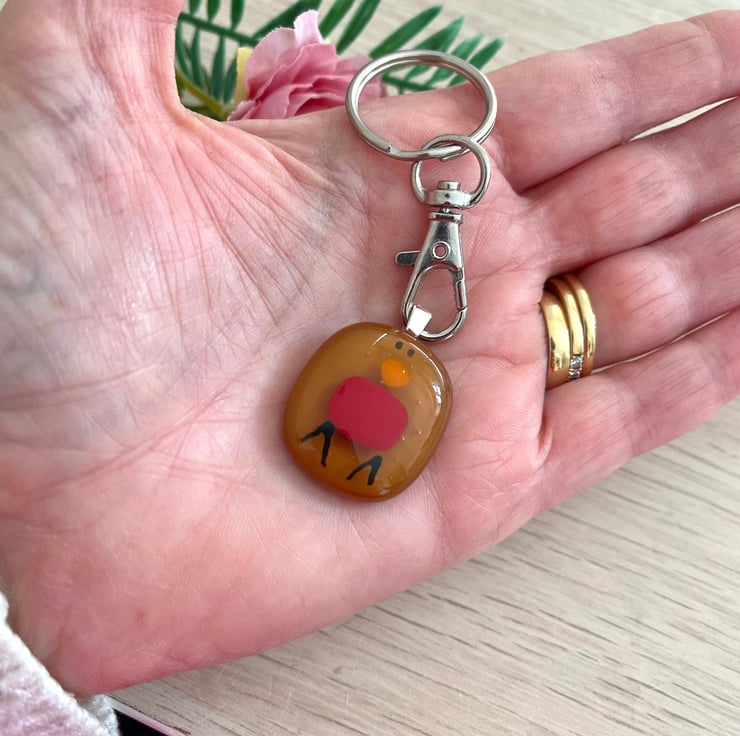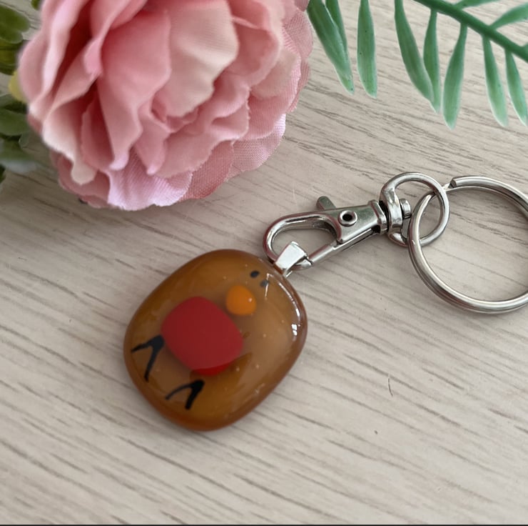 Individually handmade by fusing tiny pieces of glass together, so each robin is unique and may differ slightly from the photo. It is made with brown and red glass and hand painted eyes and feet. It comes on a split ring with a keyring trigger.
