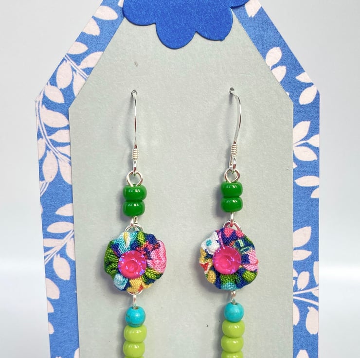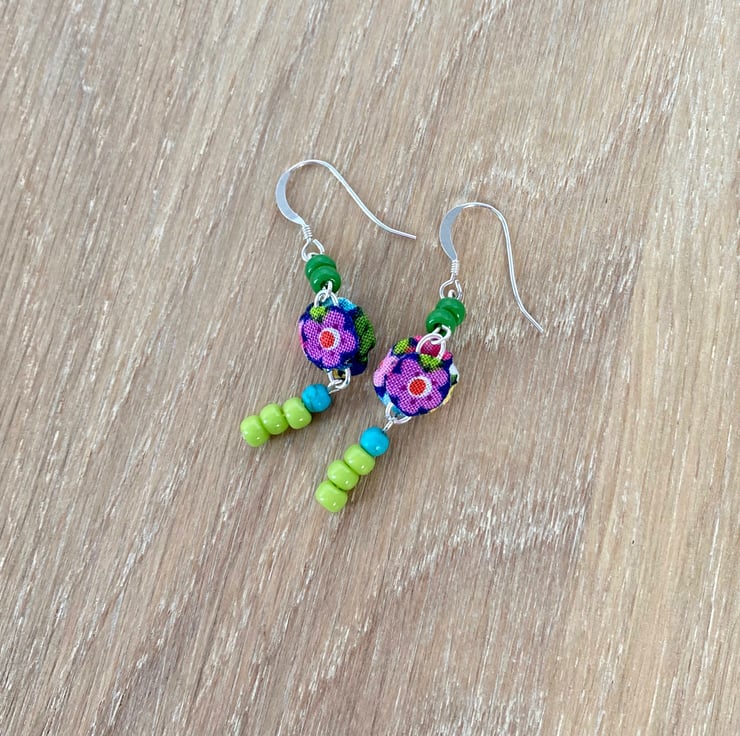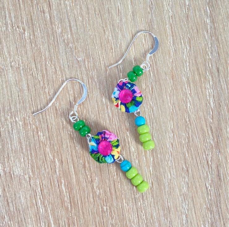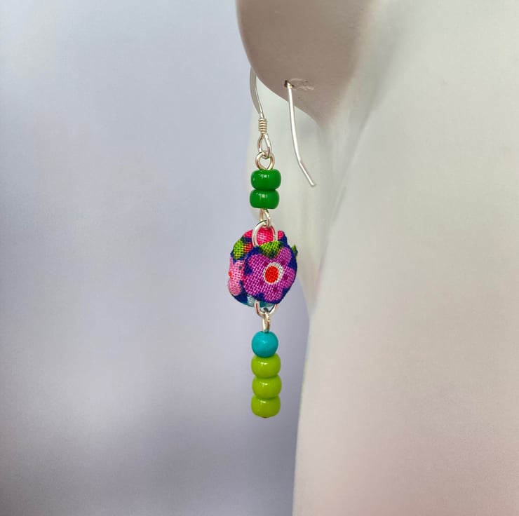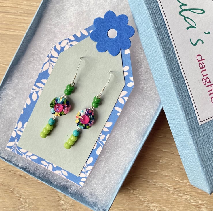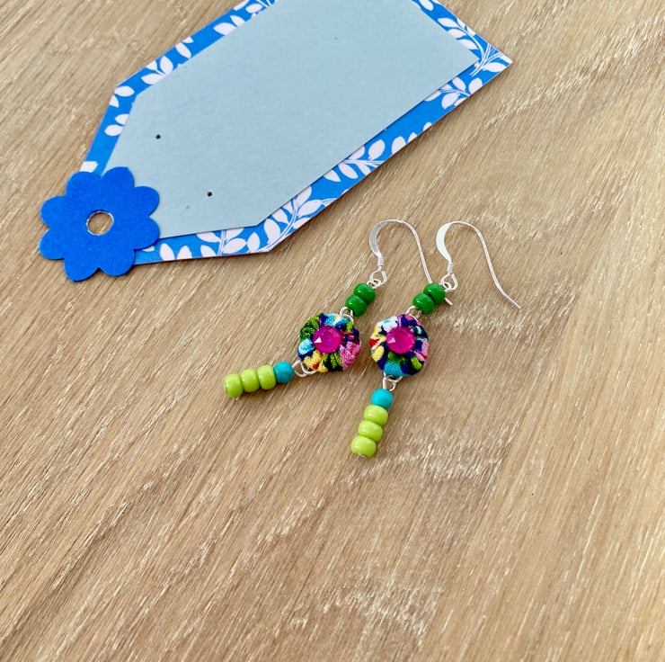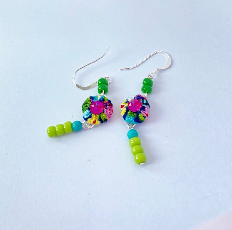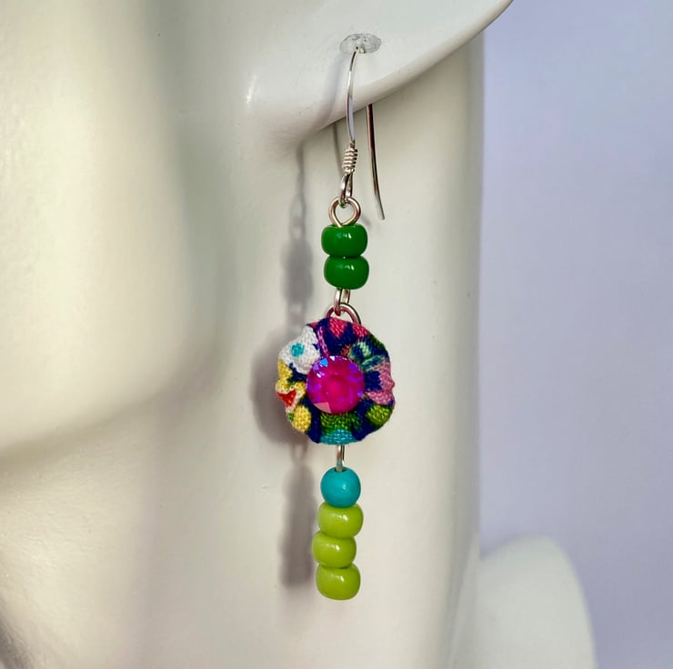 This is made from one of my favourite floral fabrics, tiny multicoloured flowers on dark blue/black. I bought the pink crystals by accident, thinking they were fuchsia pink but they have also become a favourite. They aren't quite opaque and not quite like normal mirrored crystals, and they have shots of blue in them. Pink and green - another favourite combination. I really love these versatile little earrings!