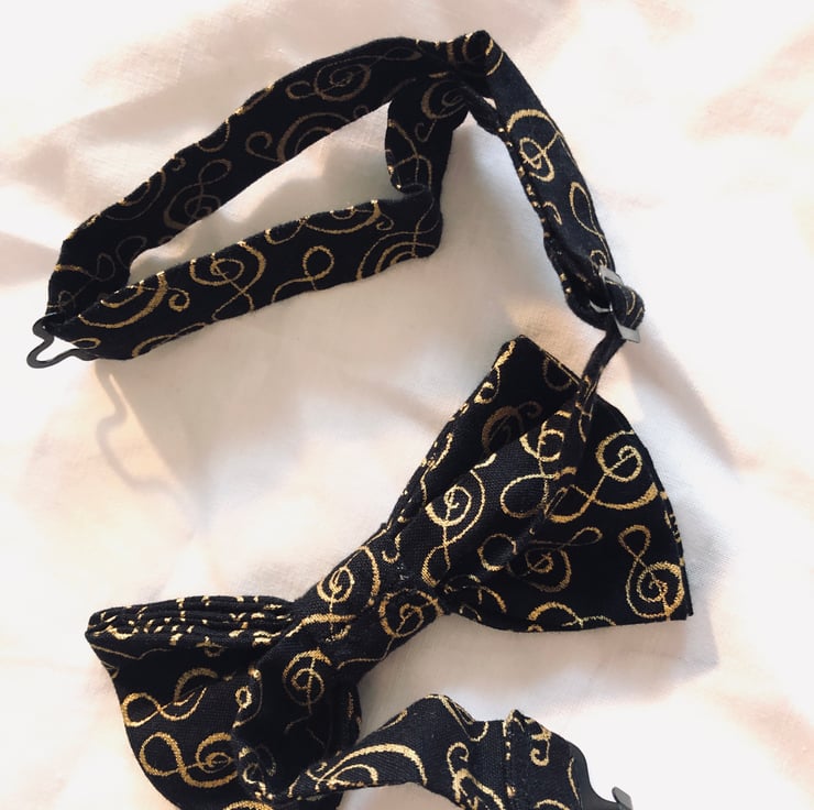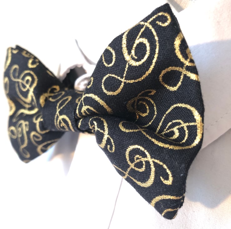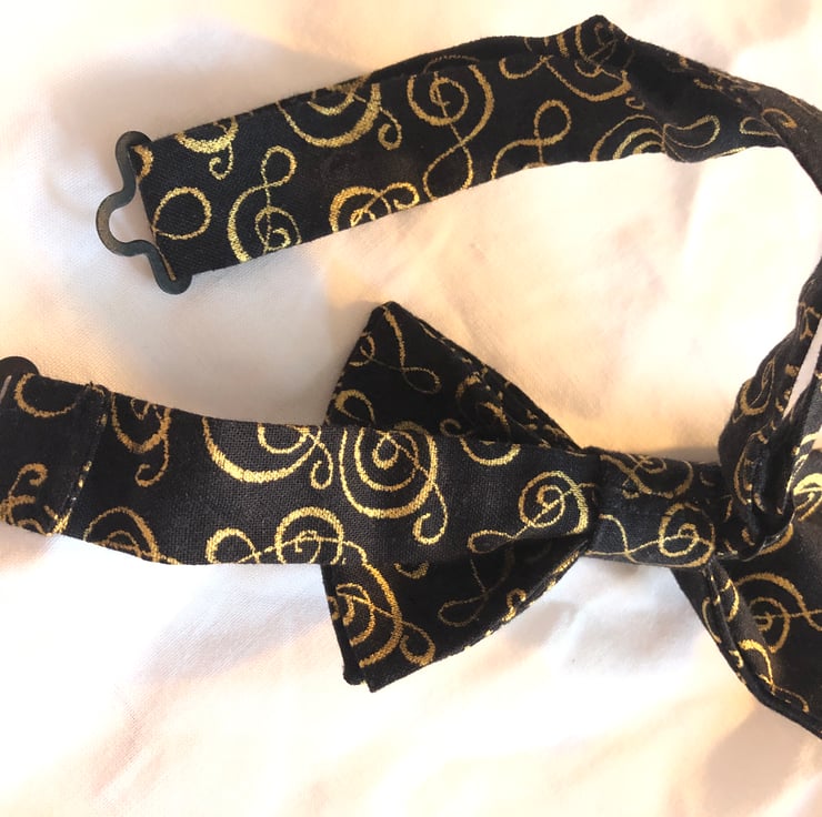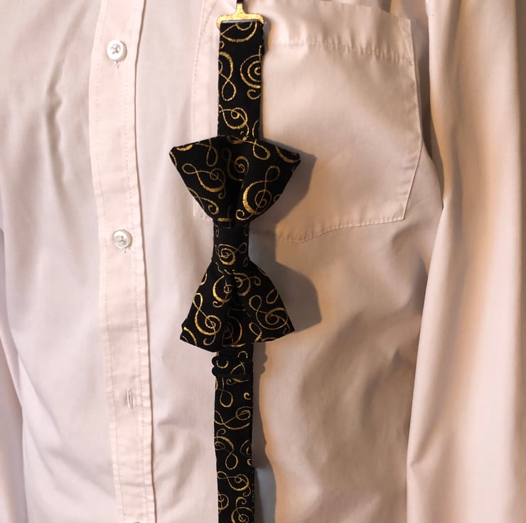 Complete an outfit with elegance and style without the fiddly tying that traditional bow-ties need. Black fabric with gold treble-clef pattern. Ideal for a music lover, composer or musician, this bow-tie makes the perfect gift. This tie has black metal fastenings.