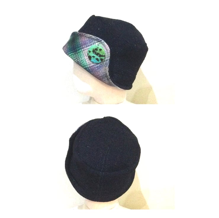 Woolly cloche hat with button back brim. Fully lined . Made to fit average headsize 22.5 “. Soft and cosy ,can be folded flat and is easy to pack away.
