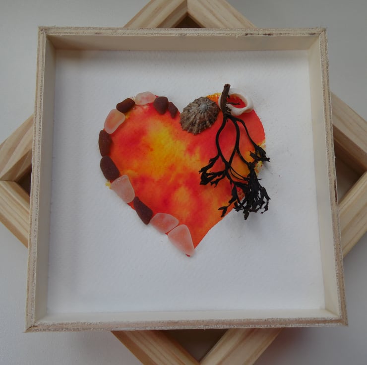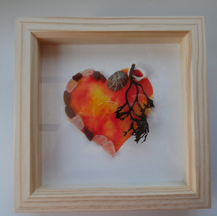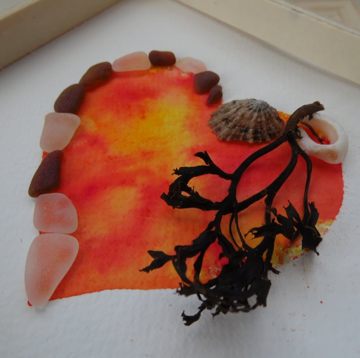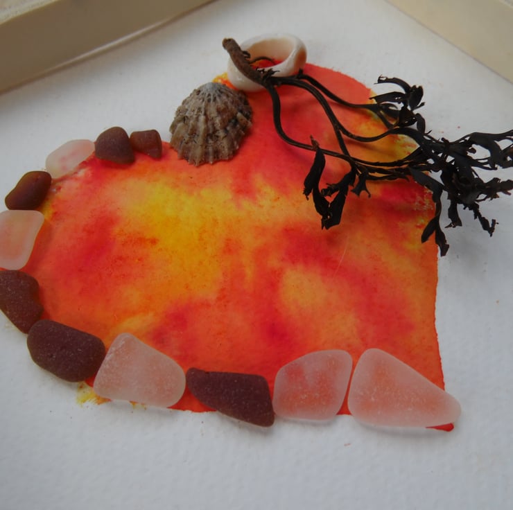A beautiful sunset orange & yellow tie-dye Heart of Cornwall made with Cornish sea glass, sea weed & sea shells.
