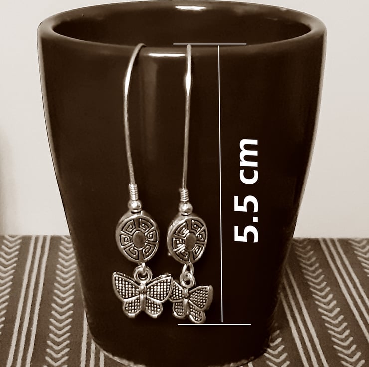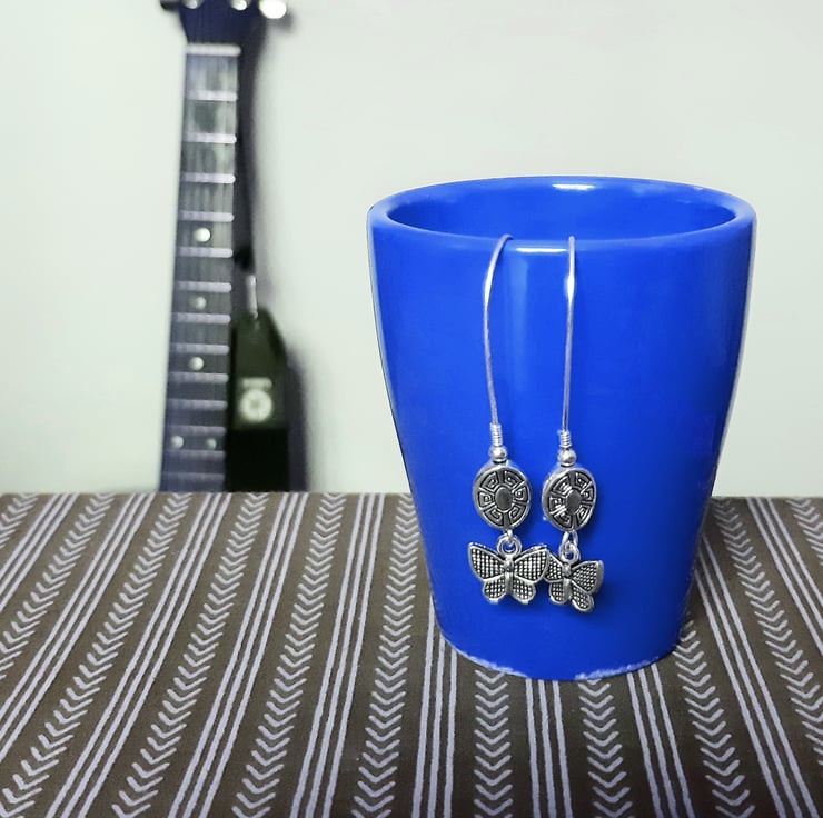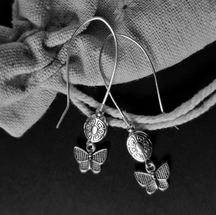 A charming and fun pair of earrings with carved Aztec symbol and butterflies.