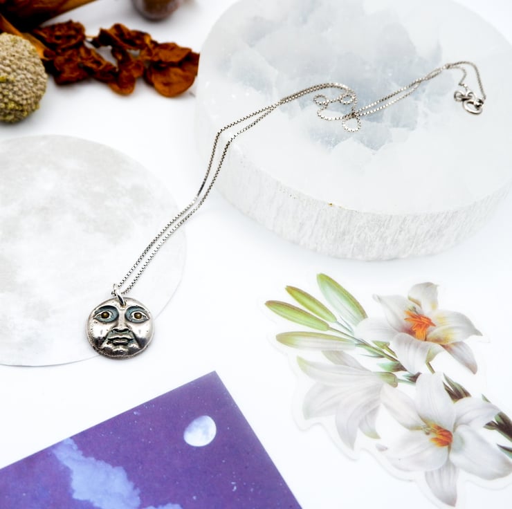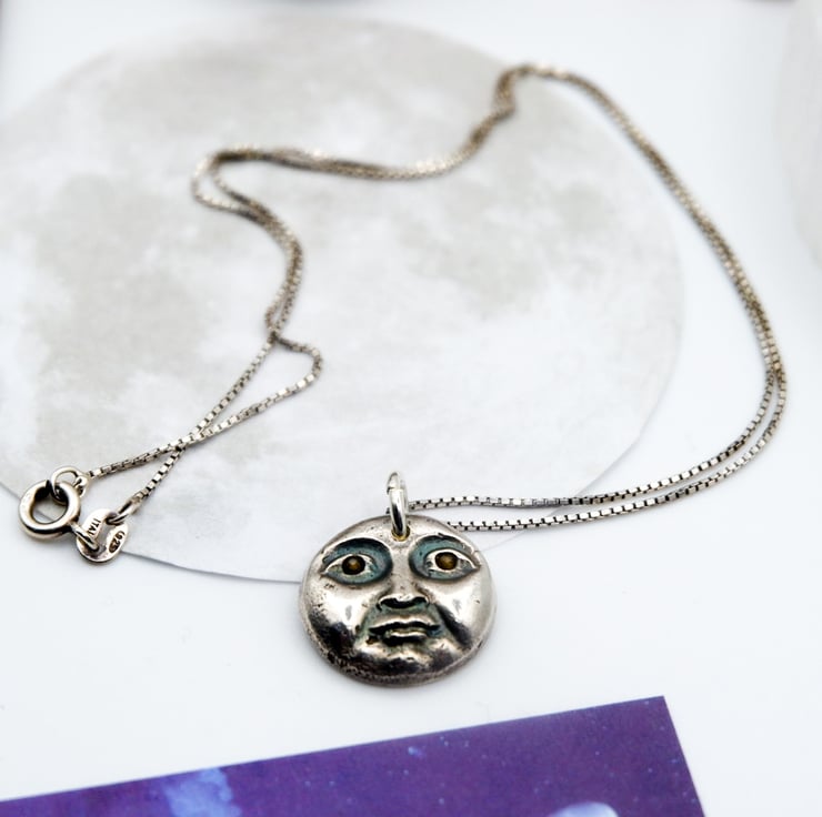 Welcome to our listing for this beautiful, one-of-a-kind solid fine recycled silver moon face pendant necklace.