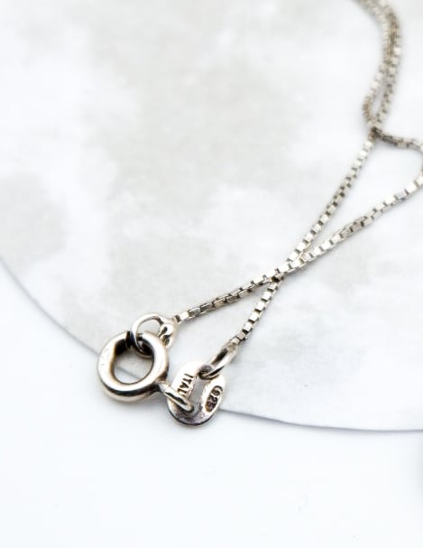 This necklace hangs from a high quality Italian box-link sterling silver chain at approximately 18 inches in length.