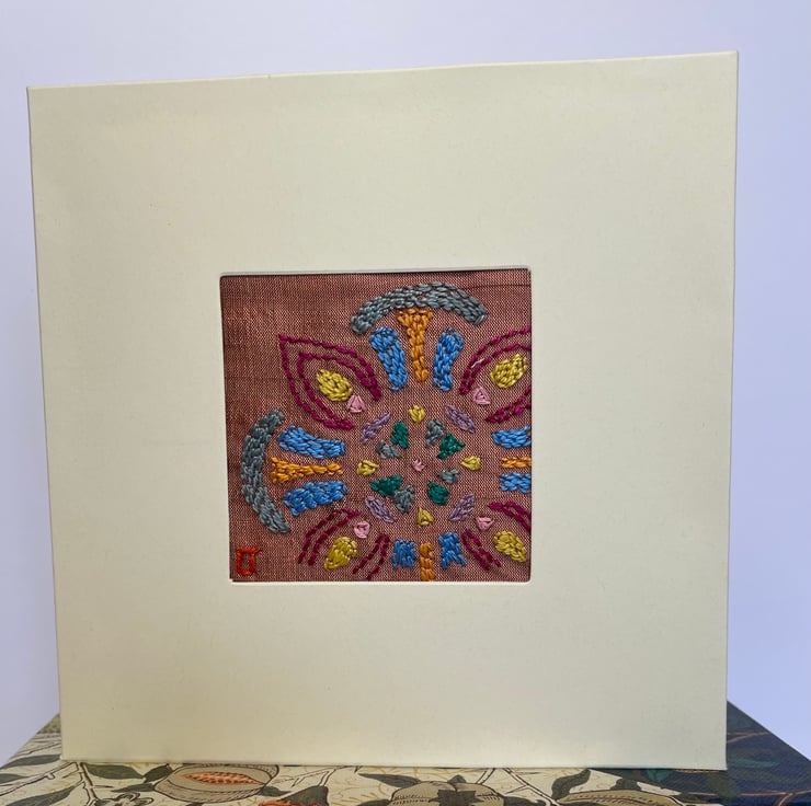 A beautiful blank card with a jewel like multi coloured hand embroidered ‘mandala fragment’ motif.