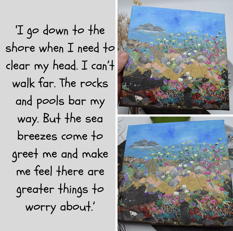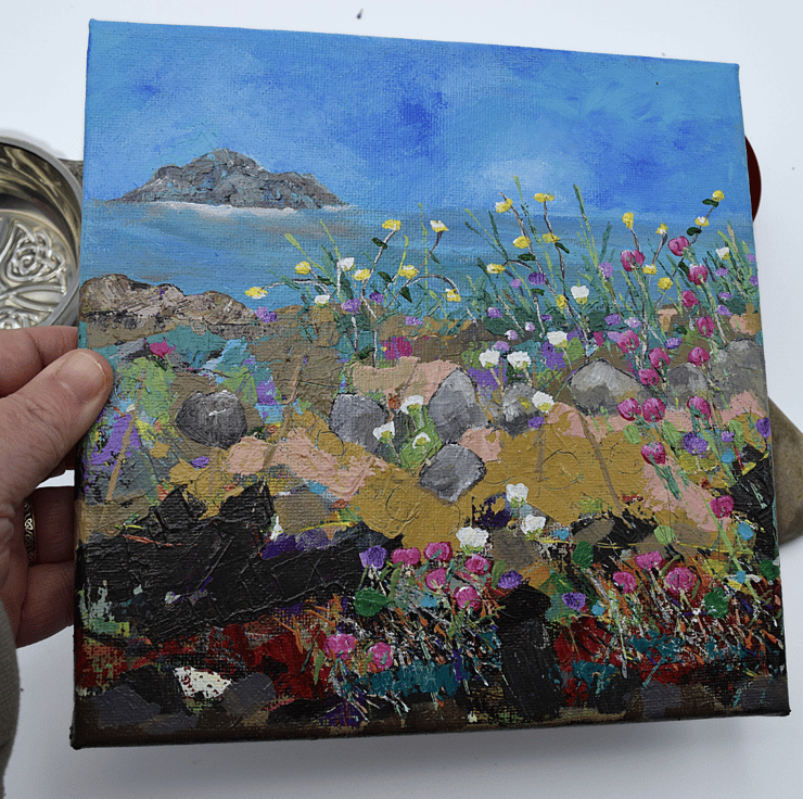 This is an original acrylic painting. In the distance of this coastal landscape, the sea is calm and inviting. A rocky island has been painted using palette knives and sponges. The foreground depicts a mix of rocks, sand and earth which provide a sheltered home for a range of coastal wildflowers.