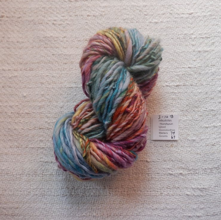 This creates a soft and springy wool yarn that is lovely to knit, crochet or nalbind. The yarn has been spun from a specially carded batt in a rainbow of colours. Each skein is unique. I call my unique blend of coloured yarns Guovsahas - the North Sami word for Northern Lights.