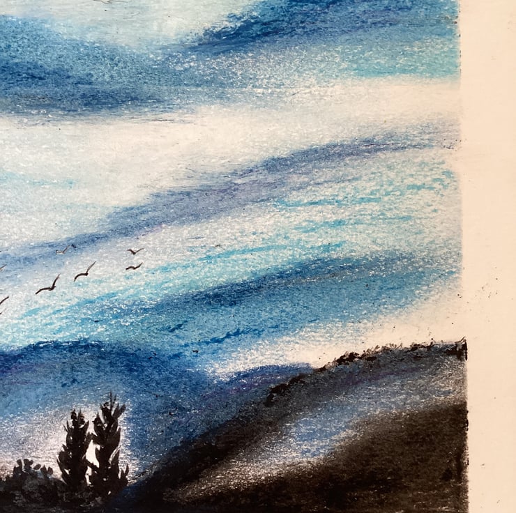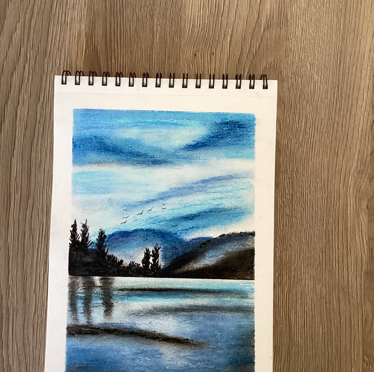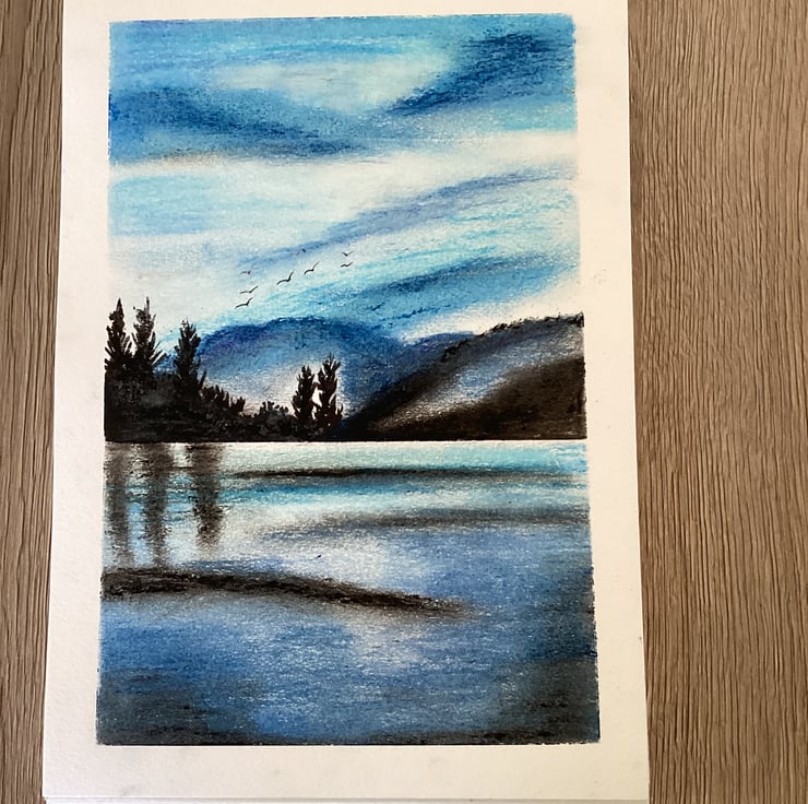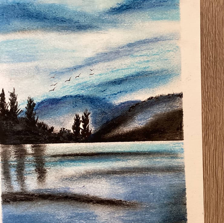Oil pastel landscape picture A4 size Lake District scene subtle light mystical .