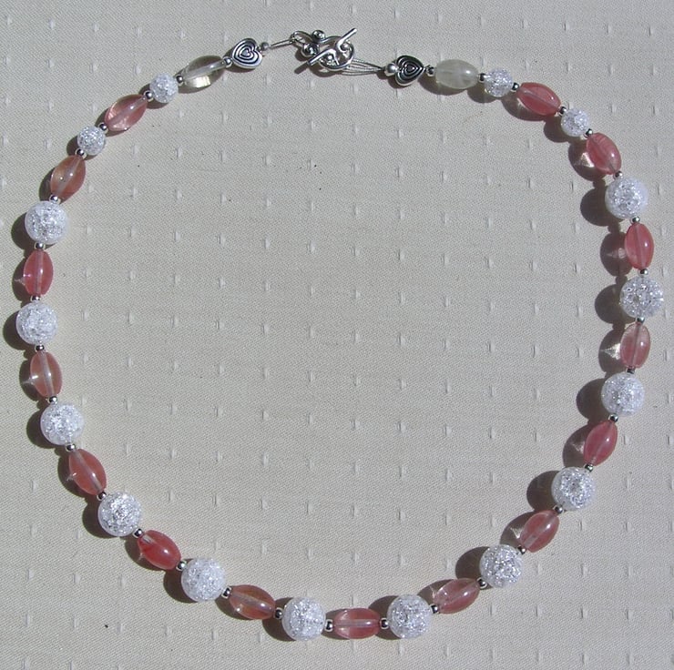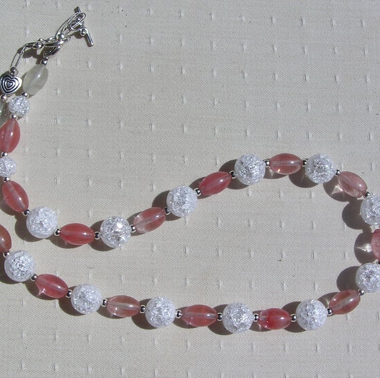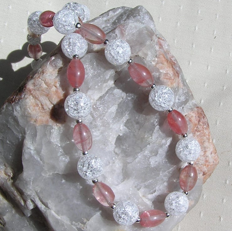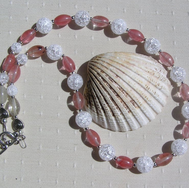This Stunning Sumptuous Necklace is made from alternating Chunky Crackled Clear Quartz round beads and Pink Watermelon Tourmaline rice-shaped beads and for that added bit of sparkle tiny Silver spacer beads - a Gorgeous Soft combination that will look stunning either worn casually or with something more Elegant for a Special Evening out