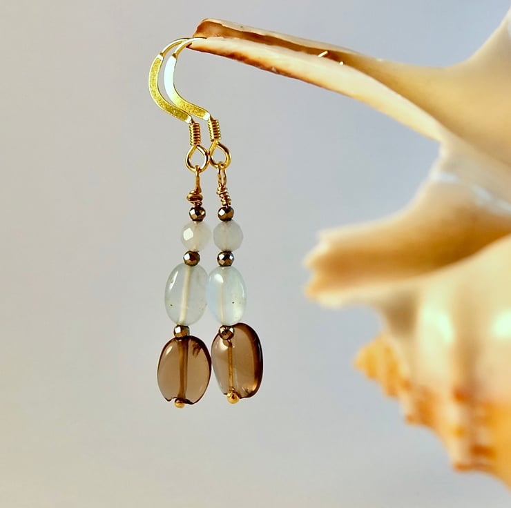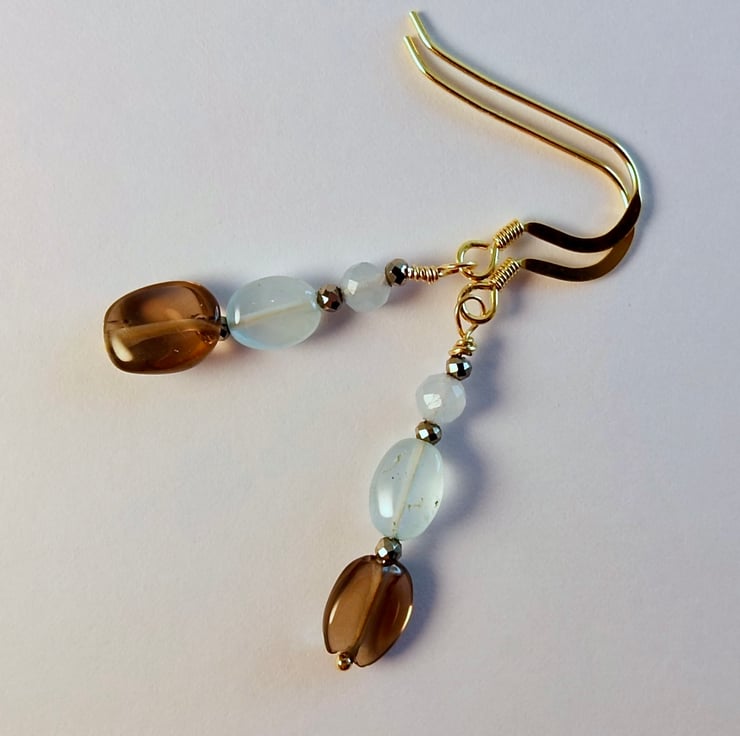 Gemstone earrings of genuine Smoky Quartz and Aquamarine oval nuggets topped with a 3.5mm faceted Aquamarine bead and separated by 2mm faceted Pyrite spacers.