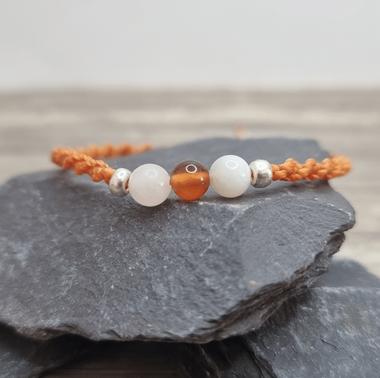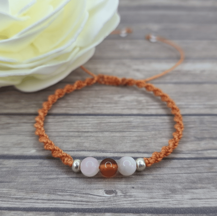 Strung on waxed Brazilian cord, made with Rose Quartz, Carnelian and Moonstone round beads (6mm).