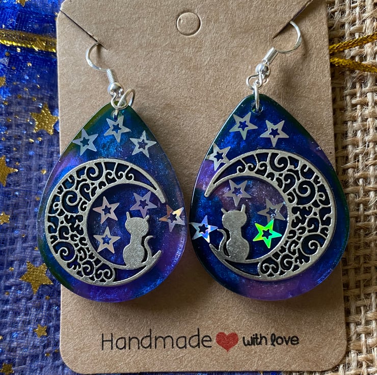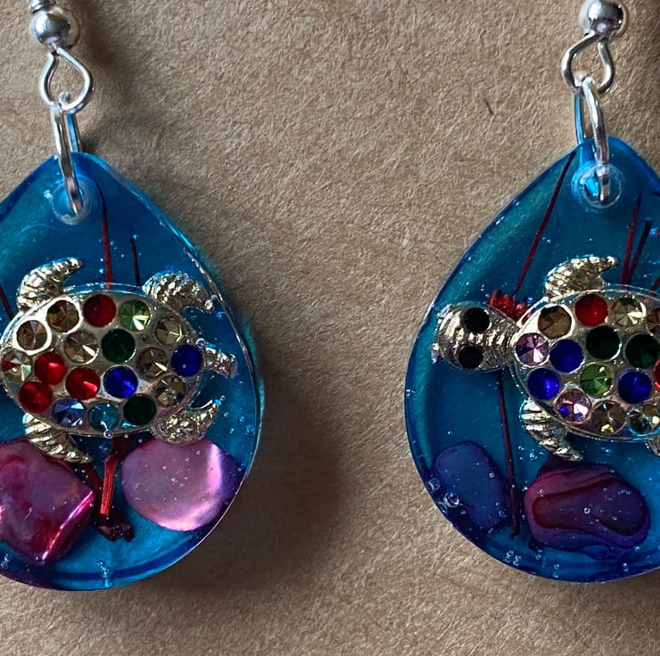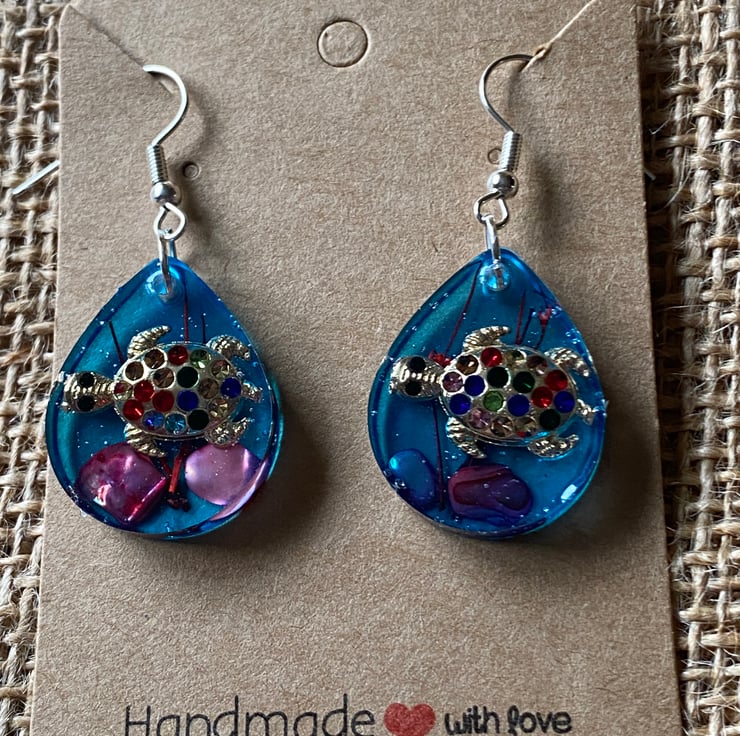 This is a pair of handmade small teardrop shaped resin earrings featuring a gold coloured turtle with rhinestones. It includes some red abalone shells and some real dried grass on a blue background. The hooks are made from Sterling silver. They are presented in a lovely organza bag. They are posted via Royal Mail 2nd class post or can be upgraded to 1st class at an extra cost.