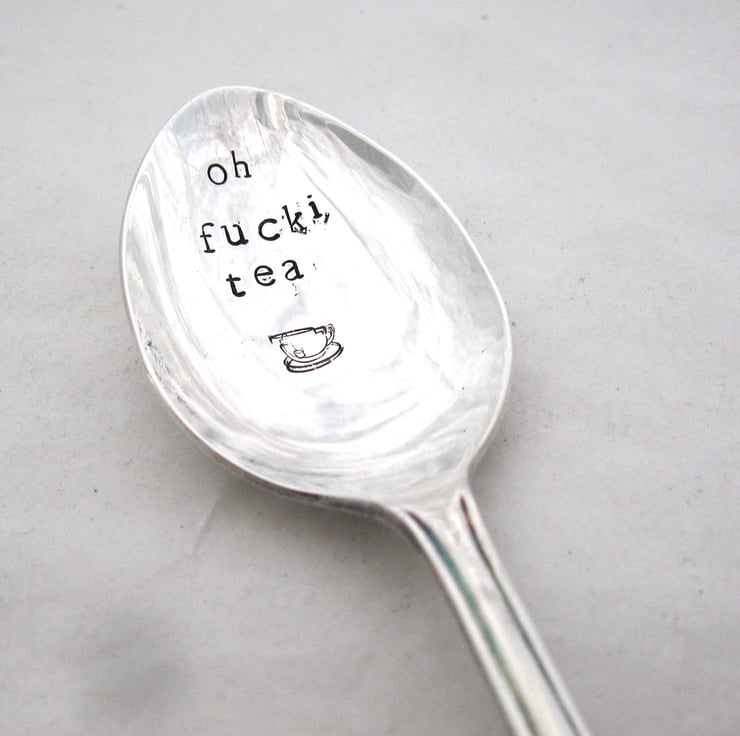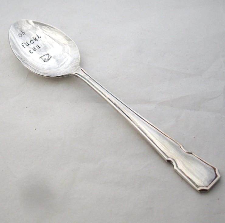 Shiny vintage silverplate teaspoon with 'oh f-cki-tea' and a little teacup hand stamped in the bowl. I hope it'll bring a smile to someone who is fed up, going through a tough time, or is just fond of a good Saxon expletive!