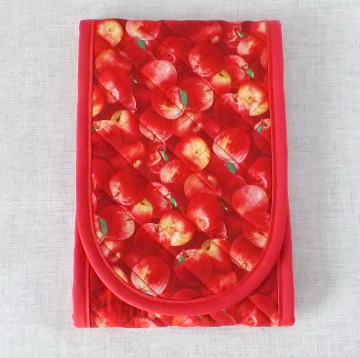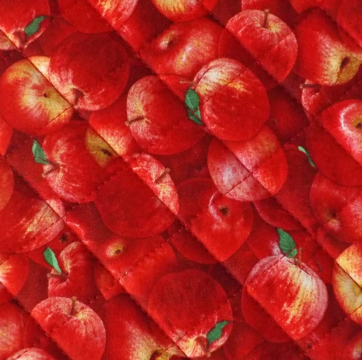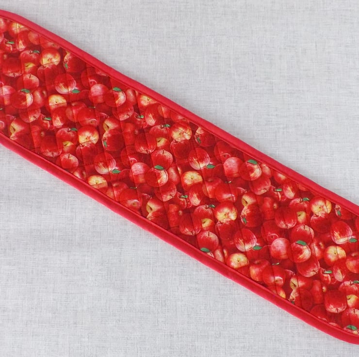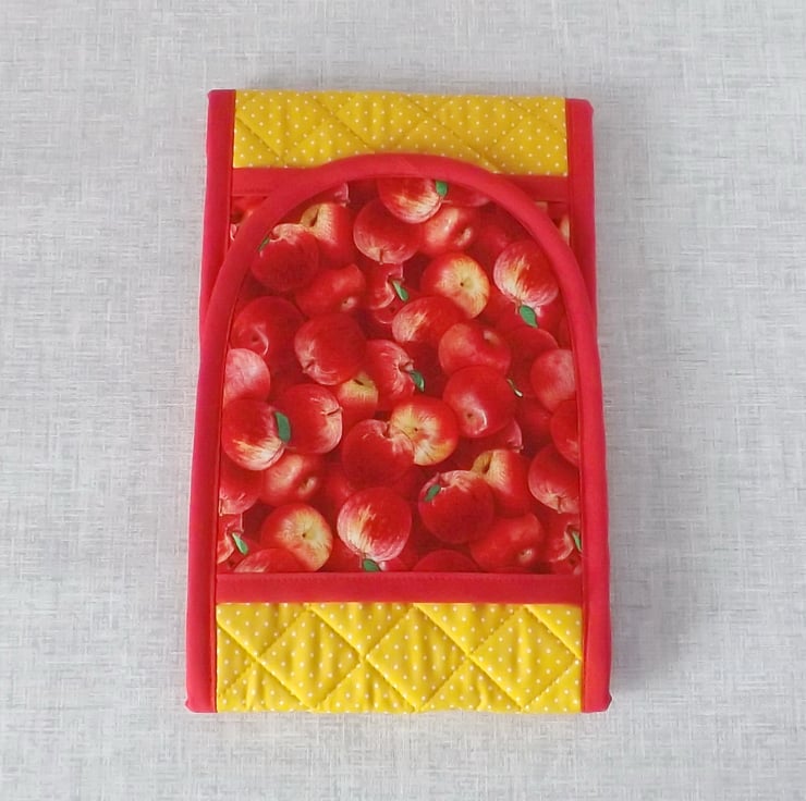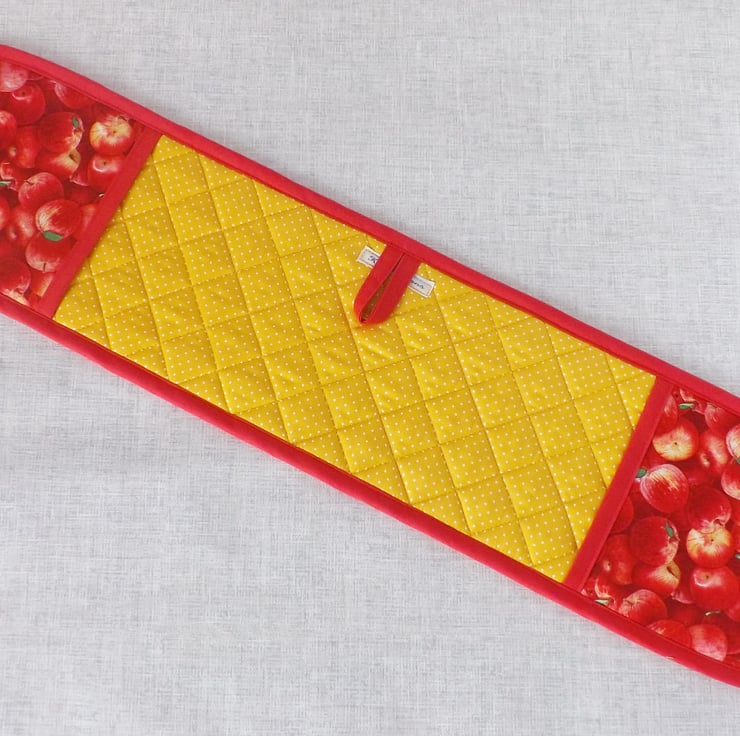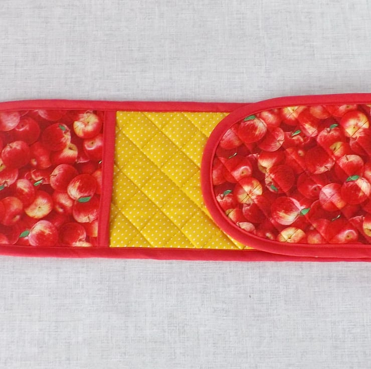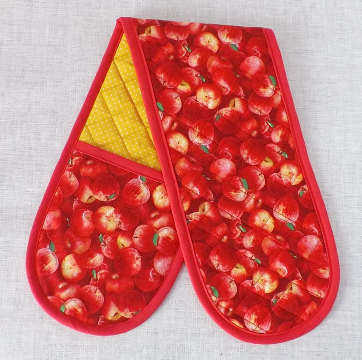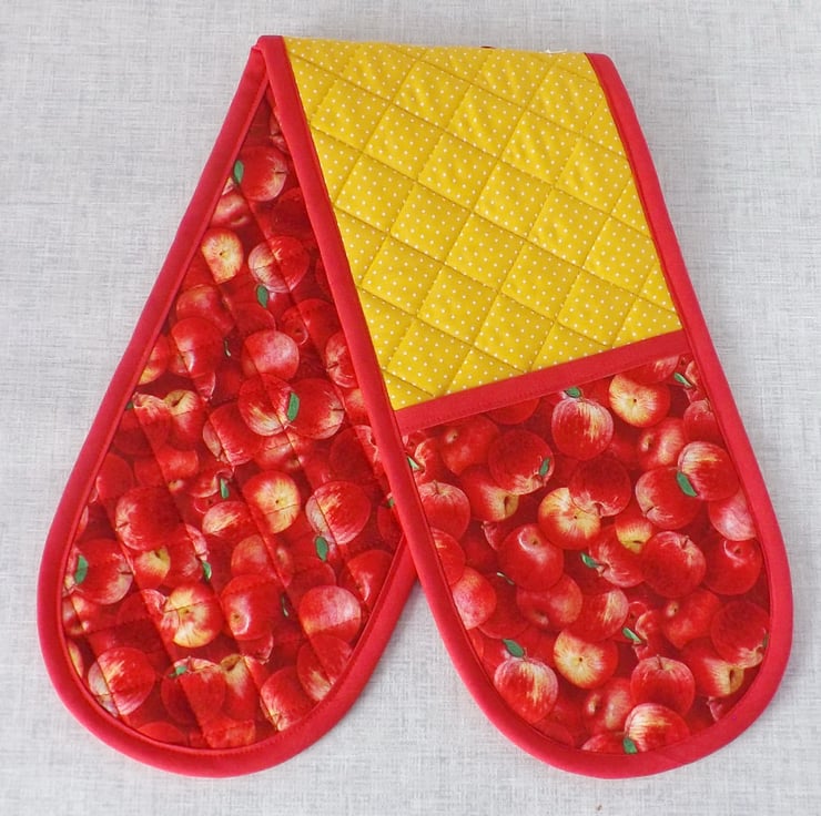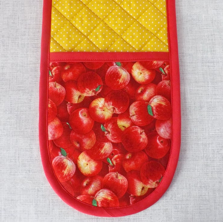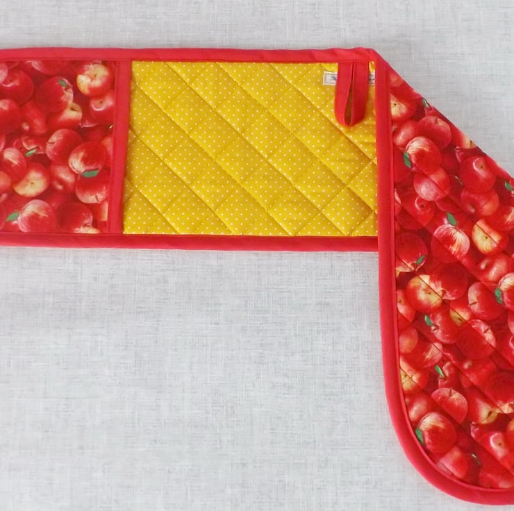 These oven gloves have been made using a lovely quilting cotton fabric of mainly red apples with a few yellow & green highlights. The contrasting fabric is a golden yellow fabric with white spots, also 100% cotton .