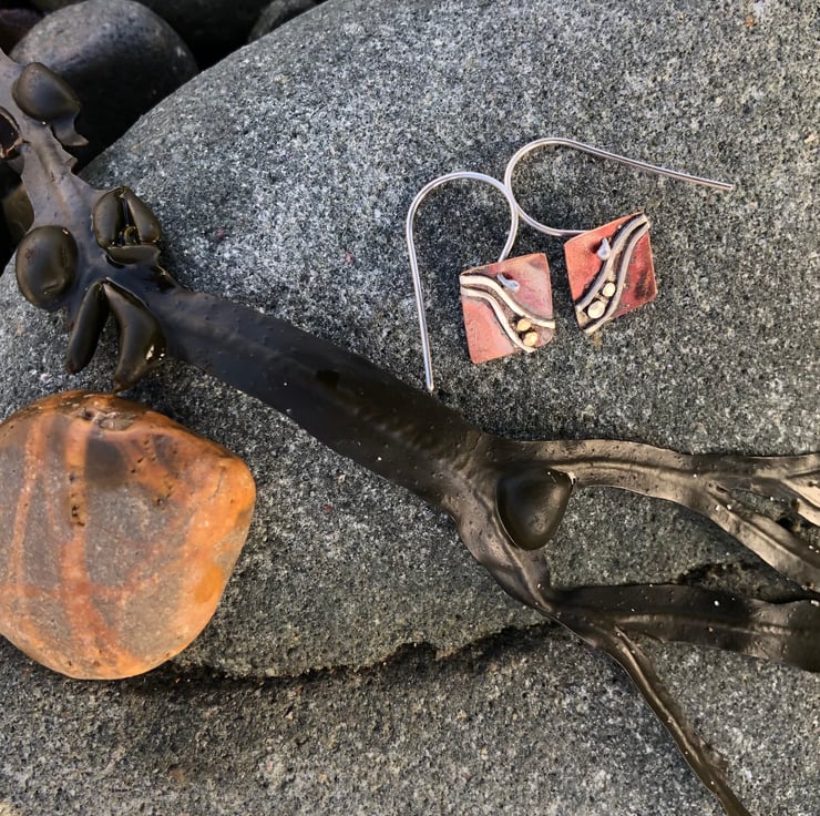 Copper square earrings with stripes of sterling silver wire and small silver circles , inspired by seaweed on the coast in West Wales.