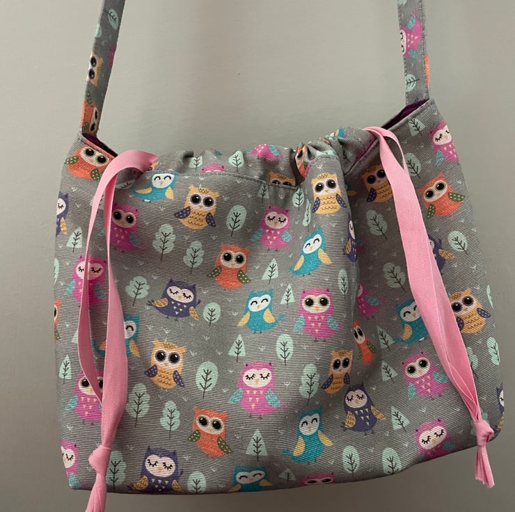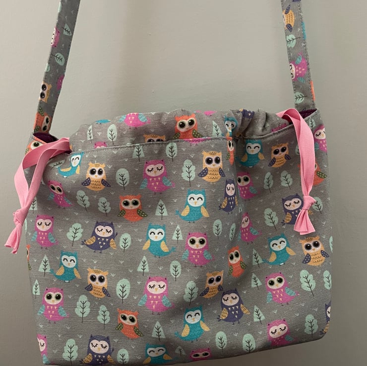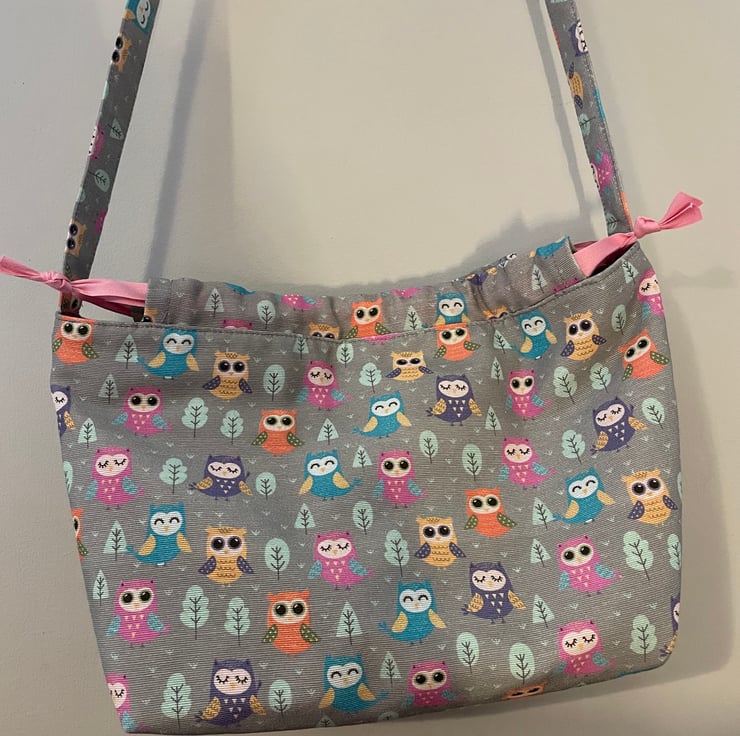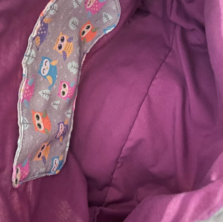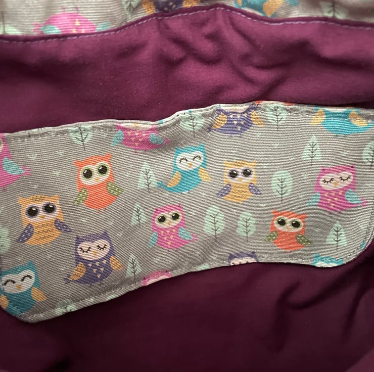 Here is my crossover body owl patterned bag, made with 100% cotton linen look fabric and lined with purple 100% cotton fabric. The bag has a lovely soft feel as it has been lined with fleece which also gives it body.