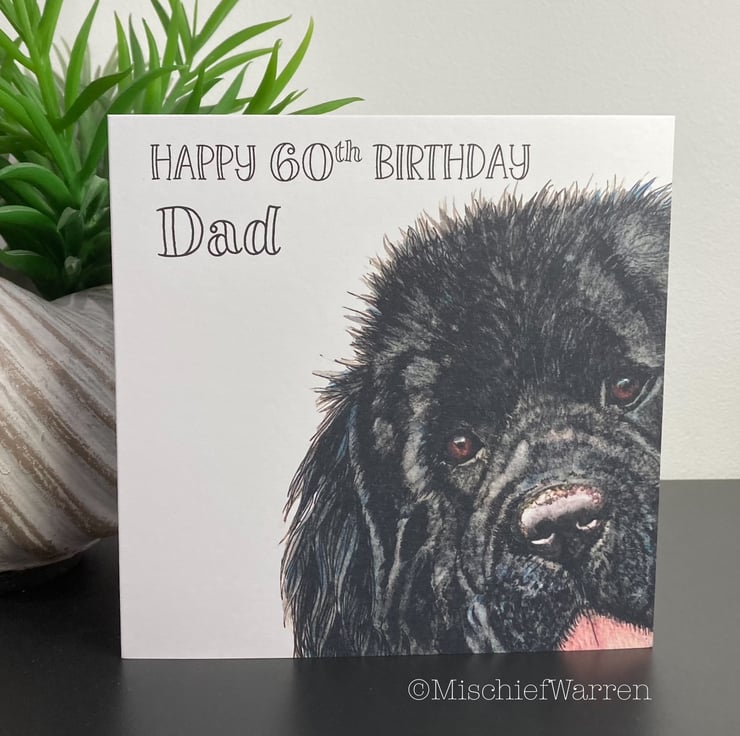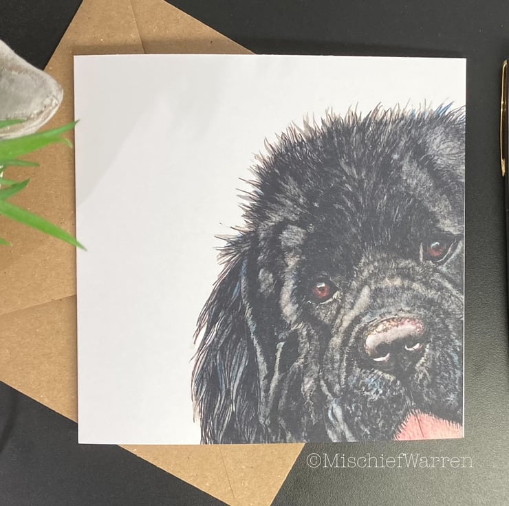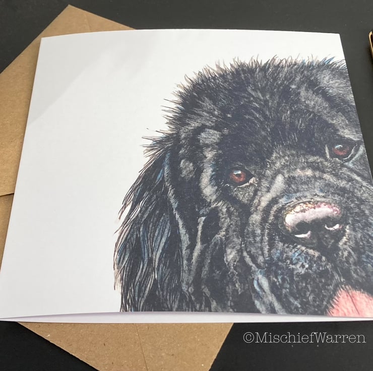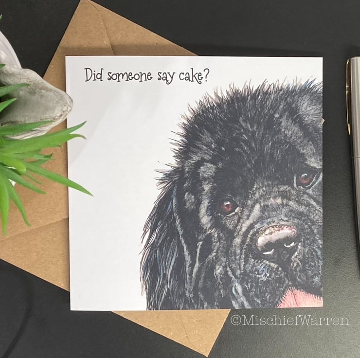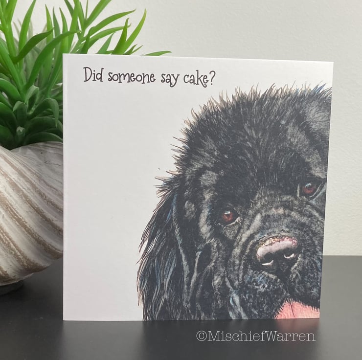 This card features a print of my Newfoundland (Newfie) dog ink and watercolour illustration. I can add a personalised message to the front for any occasion; birthday, congratulations, Mother’s Day, Father’s Day, Christmas, Thank you, etc. I particularly like “Did someone say cake?” as it covers any occasion involving cake! (maybe a wedding or anniversary). I’m very happy to write a message inside for you and send direct to the recipient.