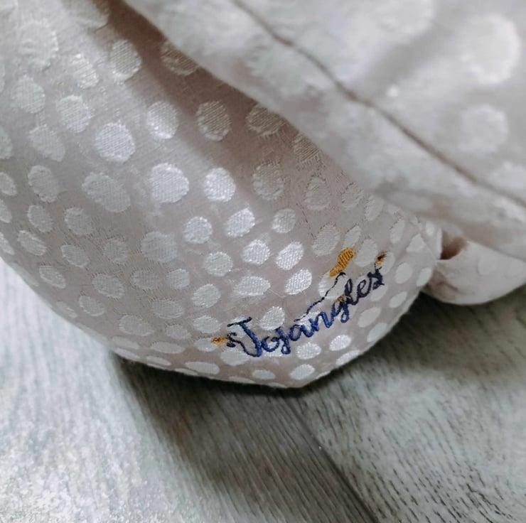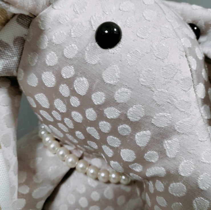 She is made from upcycled curtain fabric and wears a strand of faux pearls around her neck with such elegance.