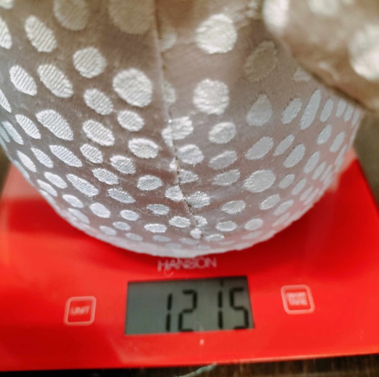 She sits approx. 27cm from the base of her back to the top of her head and weighs 1215g