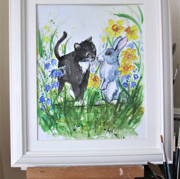 A curious cat and a grey Rabbit meeting each other. The cat is communicating with the rabbit and touching noses. Daffodils and Blue Bells indicate Spring Time.