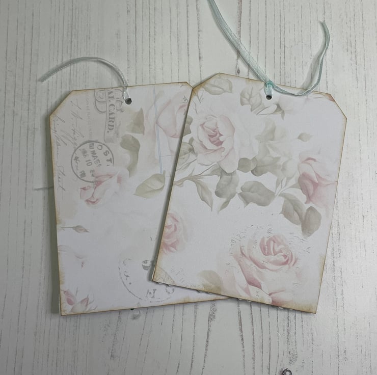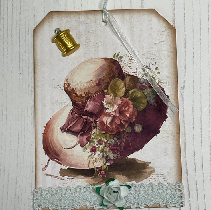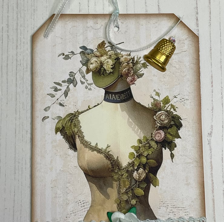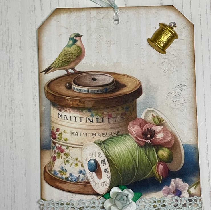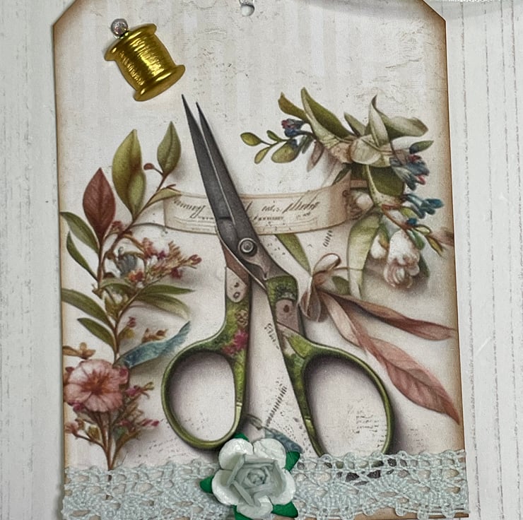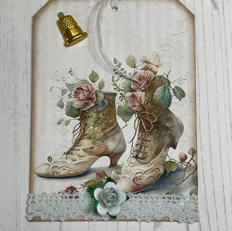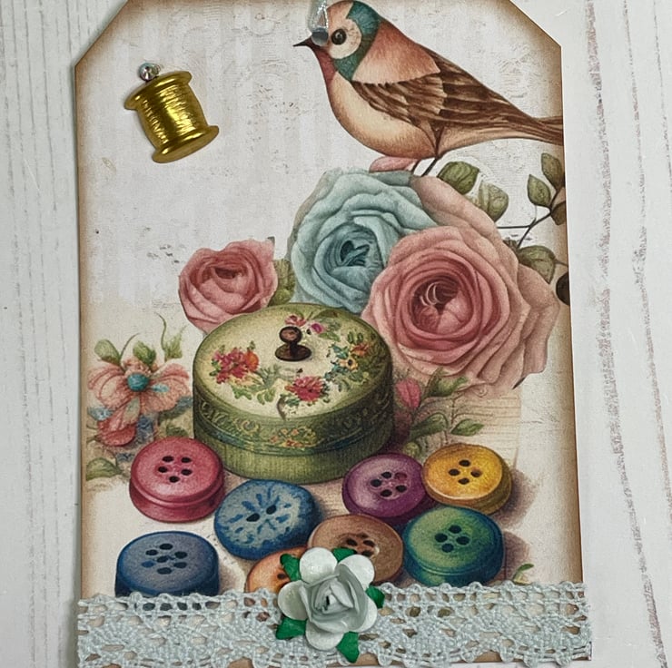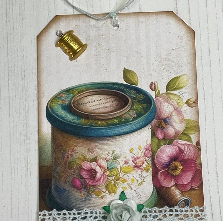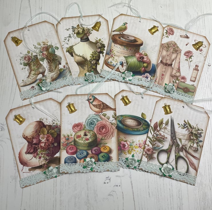 Set of eight tags taken straight out of the designers studio. A vintage style, edged with blue lace and paper rose. Gold tone thimble with a ab diamanté at the top. Backed with a pretty rose print. Measure 4.75” x 3.3/8”