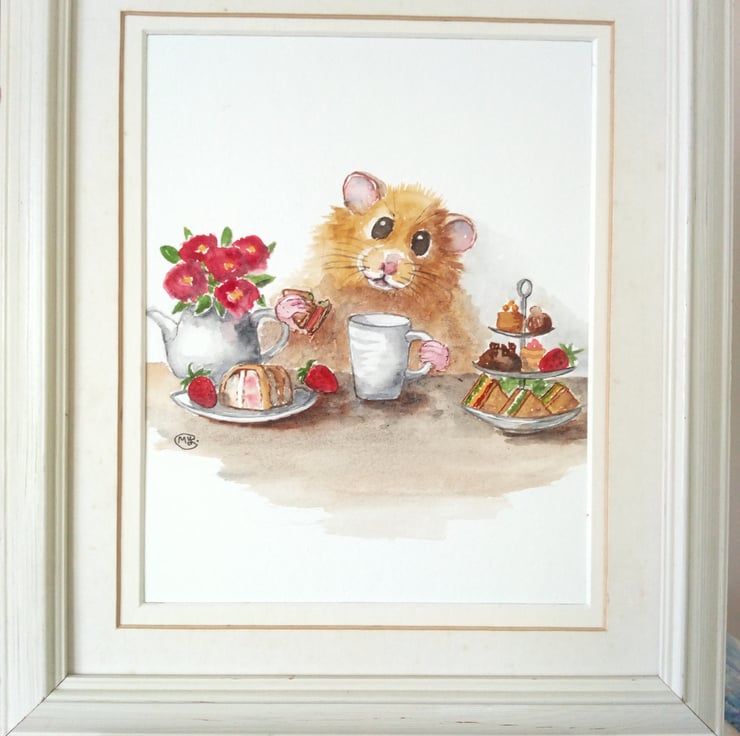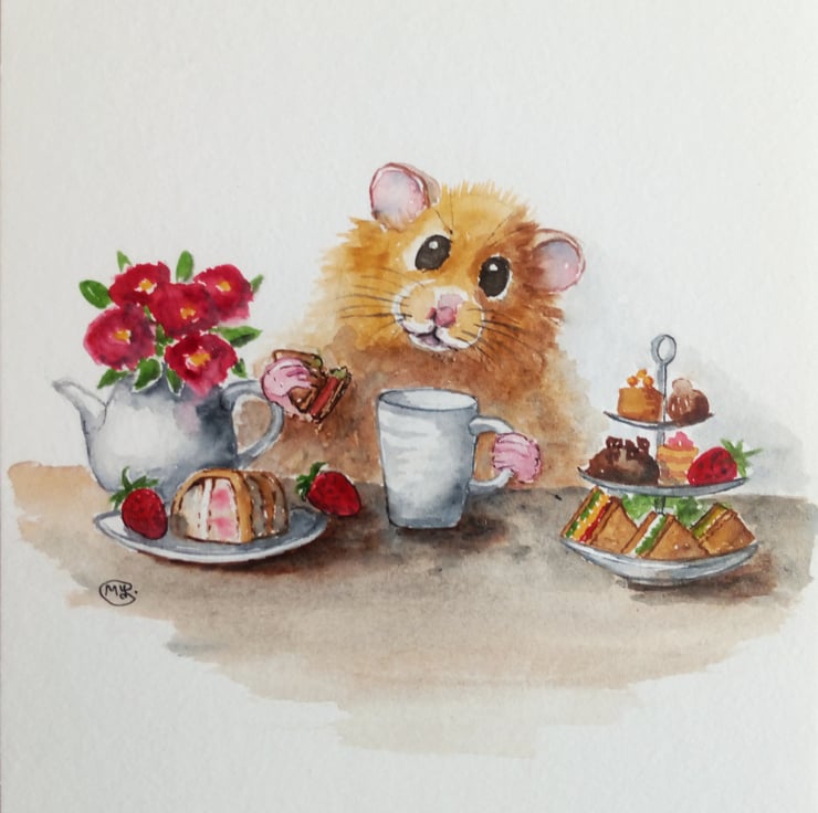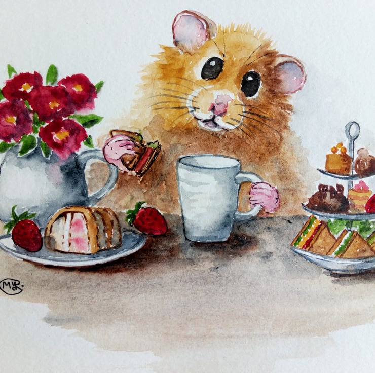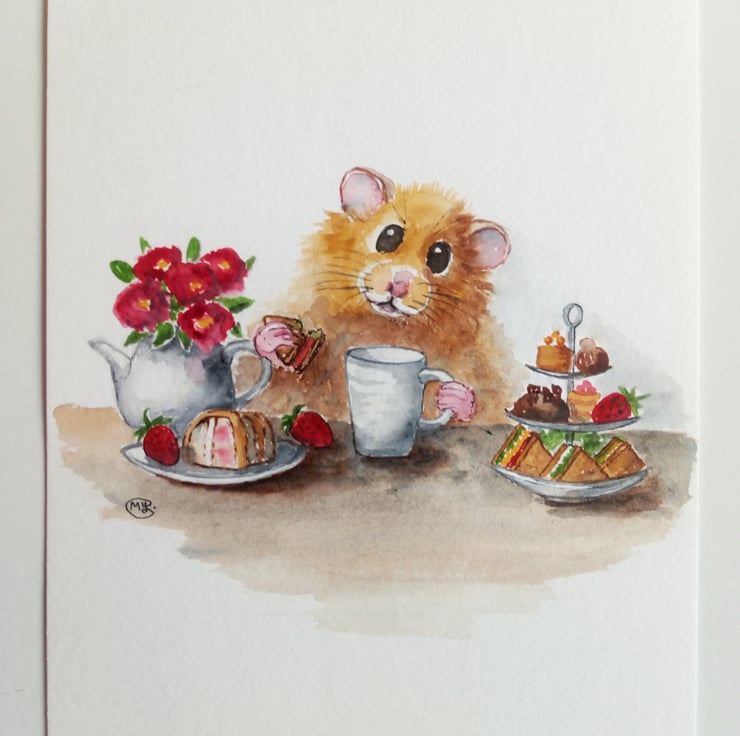 A cute mixed media painting of a hamster enjoying a cuppa in a cafe.