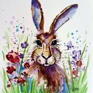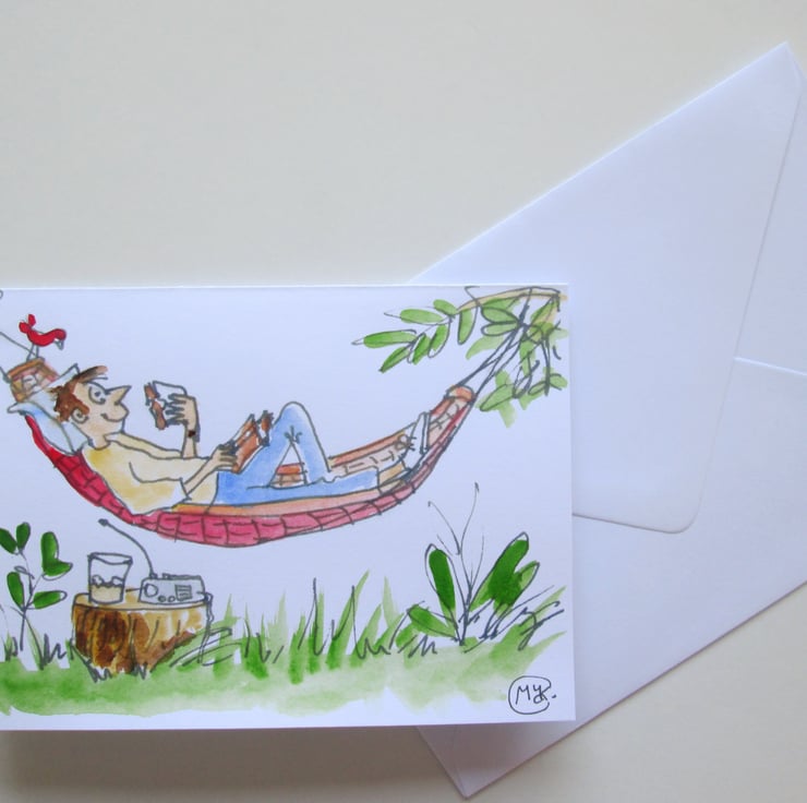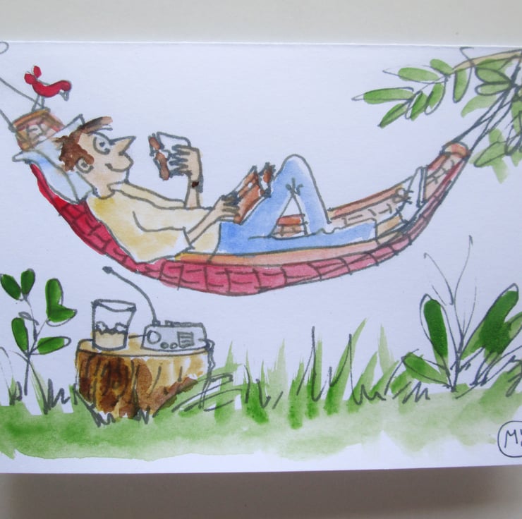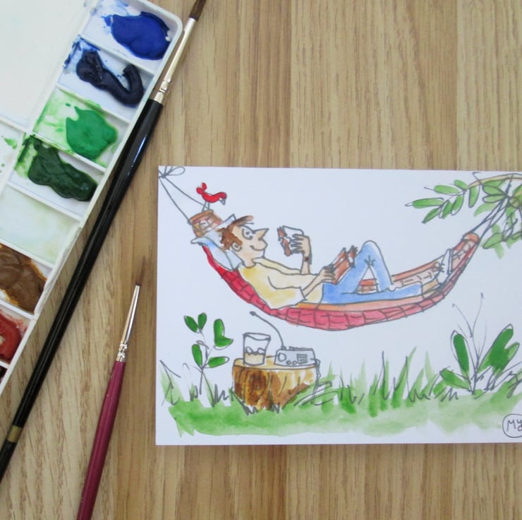 A print of my own original painting of a man in a hammock relaxing in the garden.