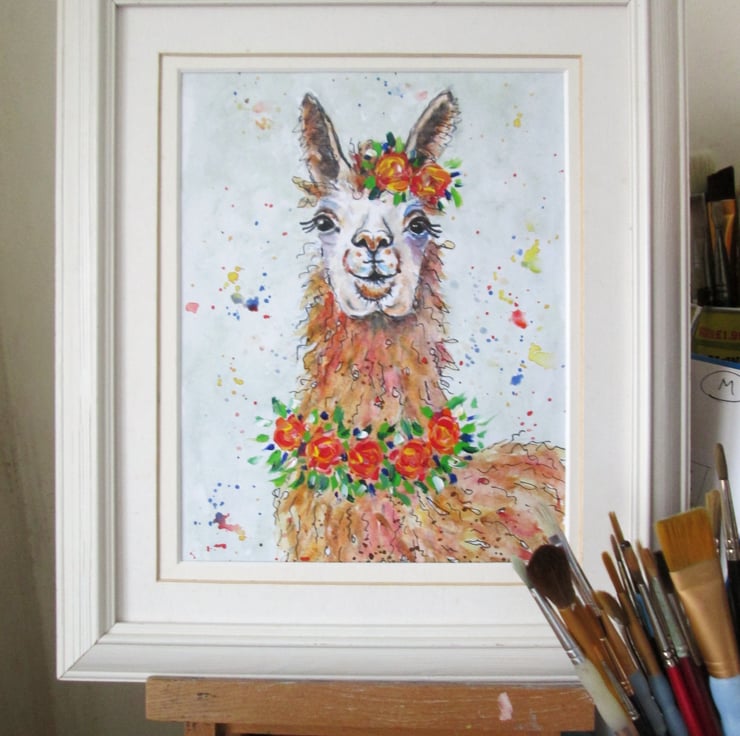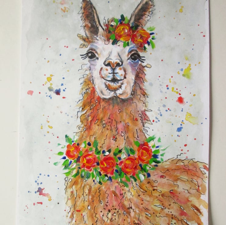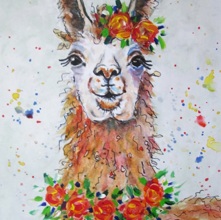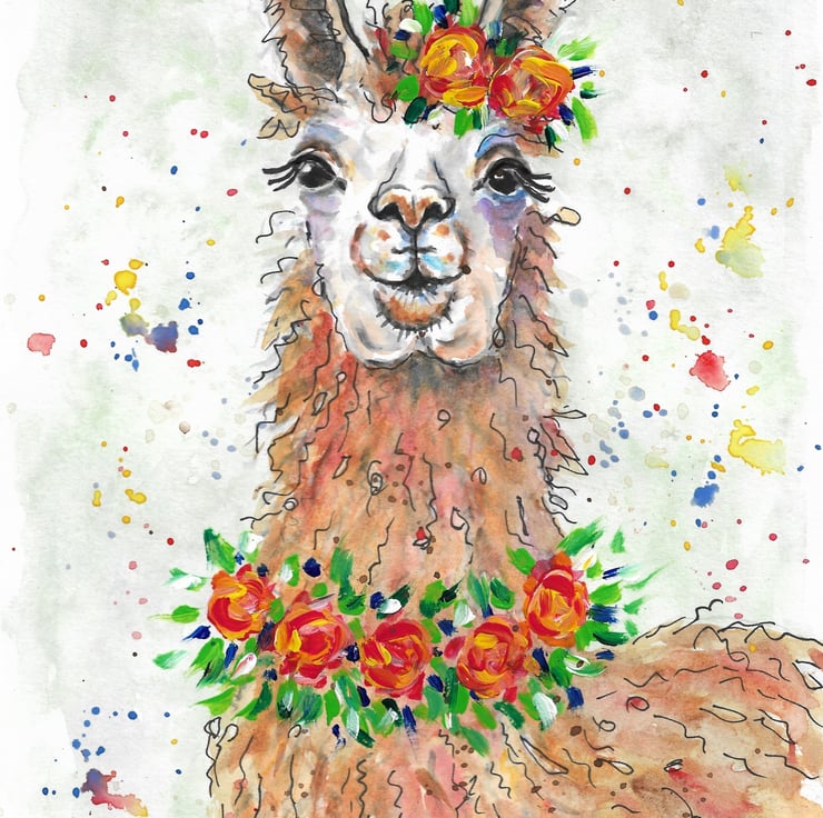 A sweet faced llama or Alpaca with flowers on a soft green background.