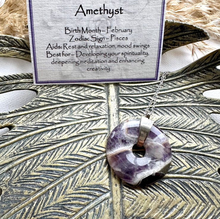 The Amethyst donut measures 30mm in diameter and comes complete with a printed card, which gives the properties associated with the Amethyst crystal. The card also gives the associated zodiac sign, which is unrelated to the specific properties of the stone.