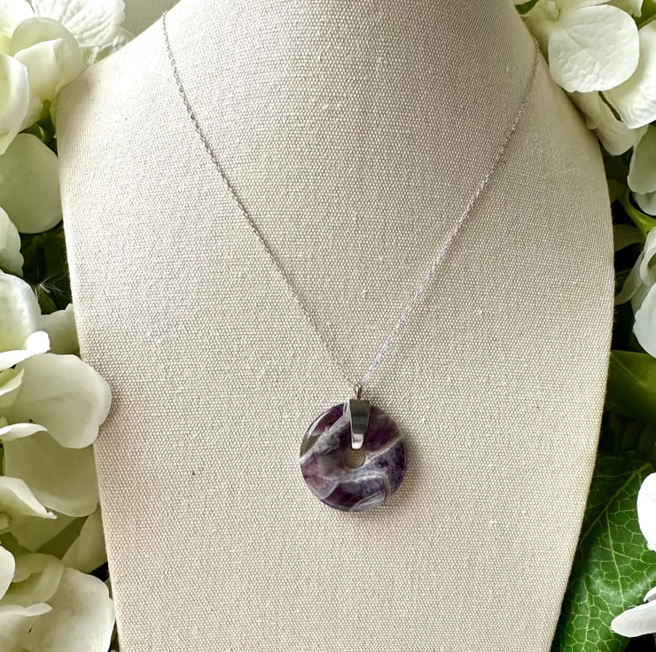 Beautiful and simple, this stunning Amethyst donut pendant is suspended on a sterling silver bail and fitted with a sterling silver 18" chain.