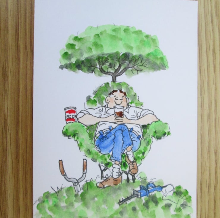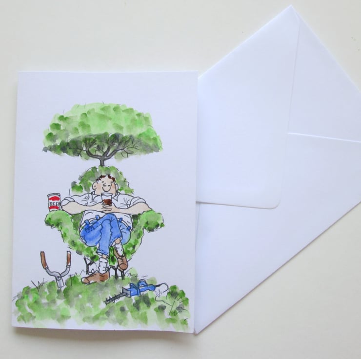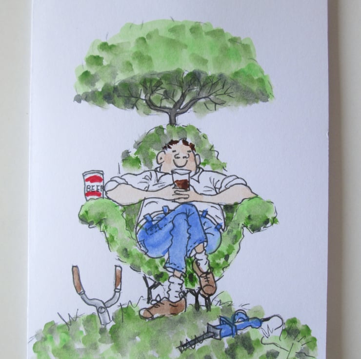 A print of my own original painting of a man on a chair, made out of a Bush, relaxing in the garden with a beer. Garden tools.