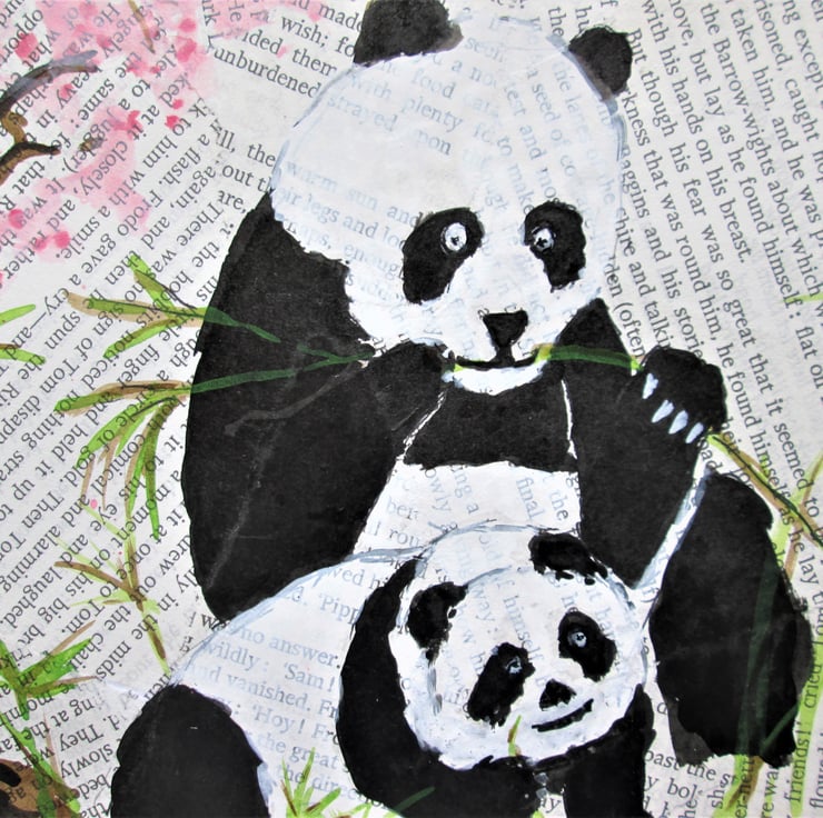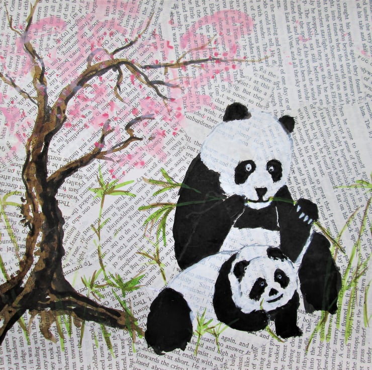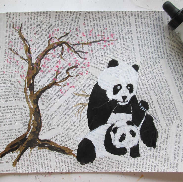 two panda bears, baby panda and mother, and a cherry tree in blossom, painted in acrylic ink on pages of 'The Hobbit'.