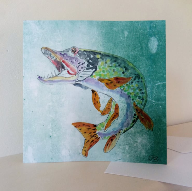 A hand-painted card with a big fish handpainted on green card paper