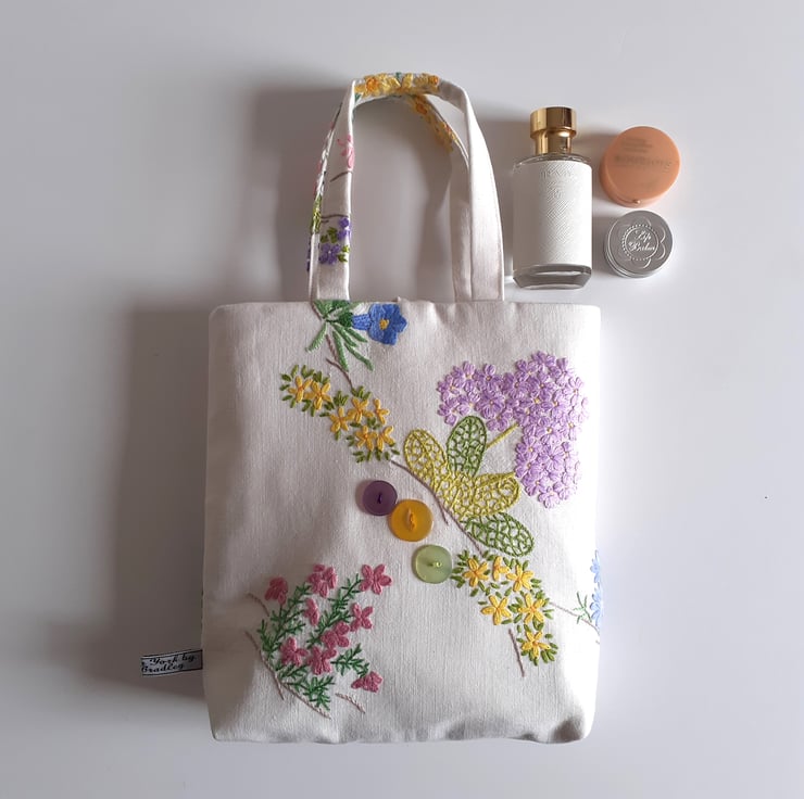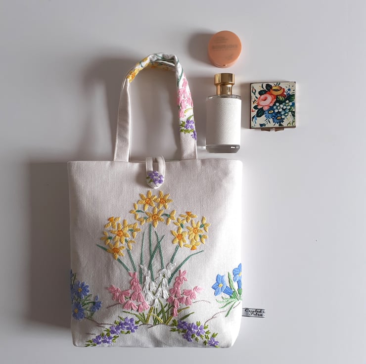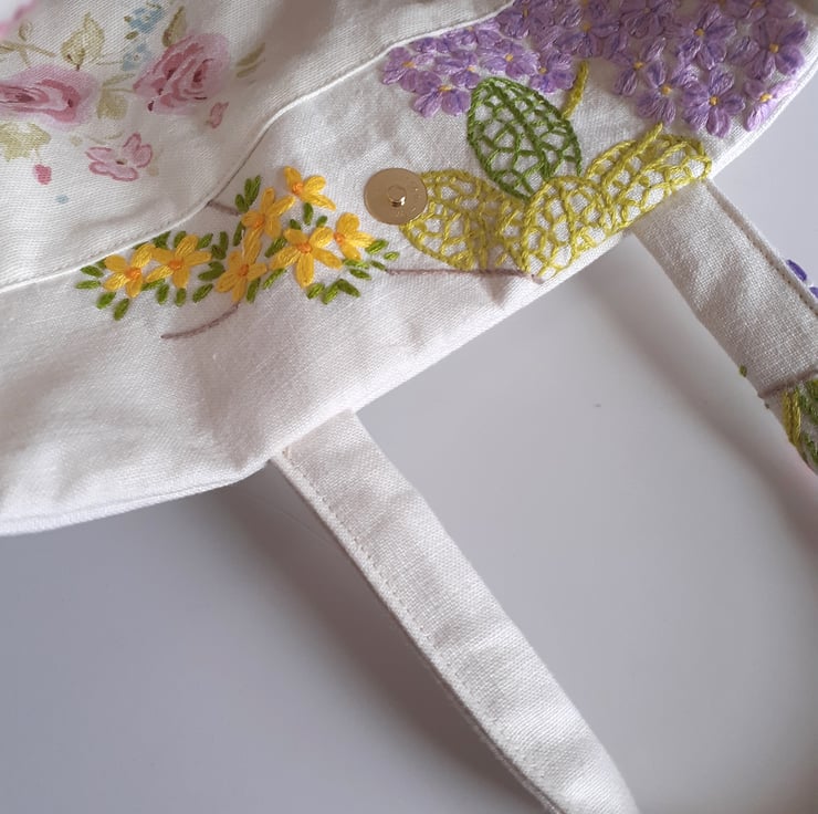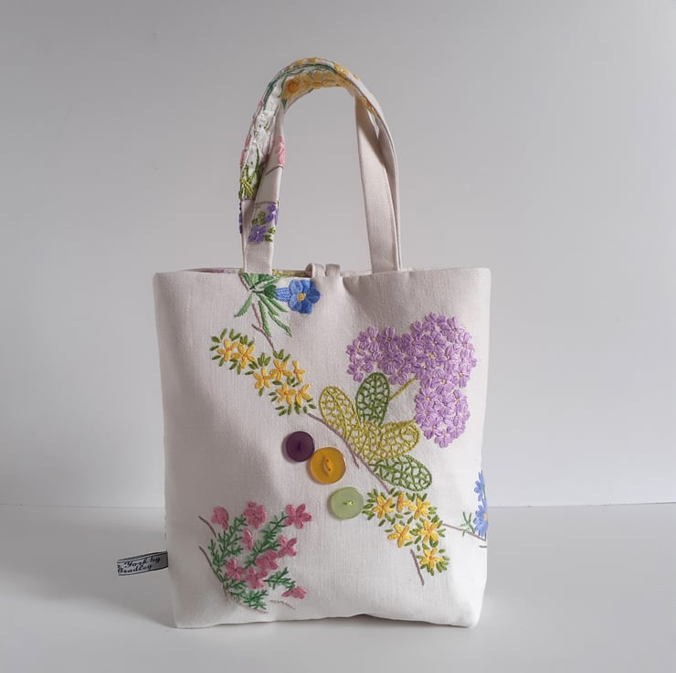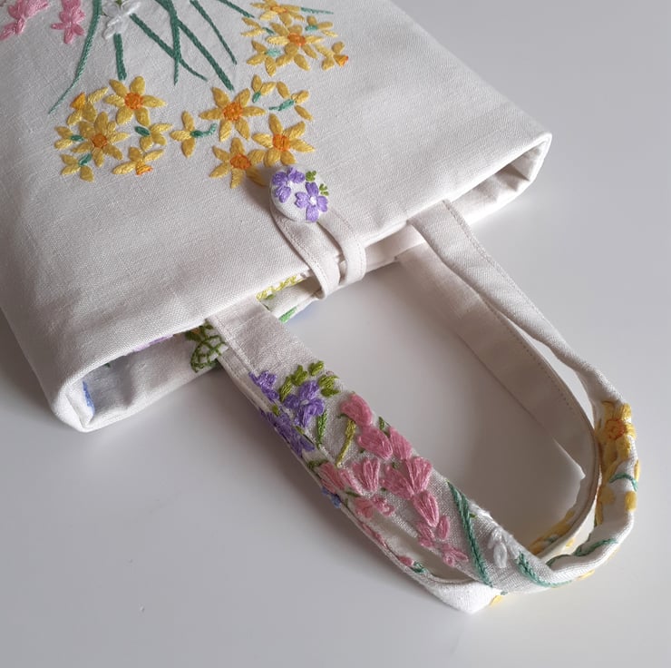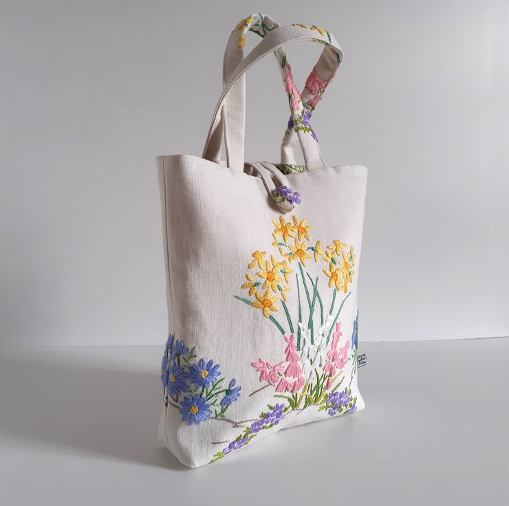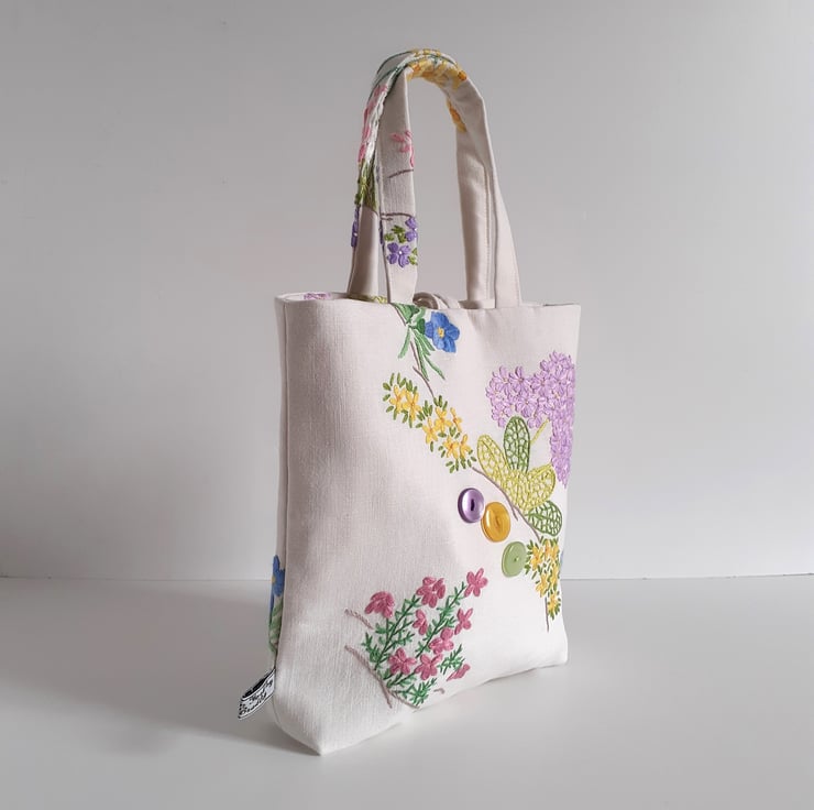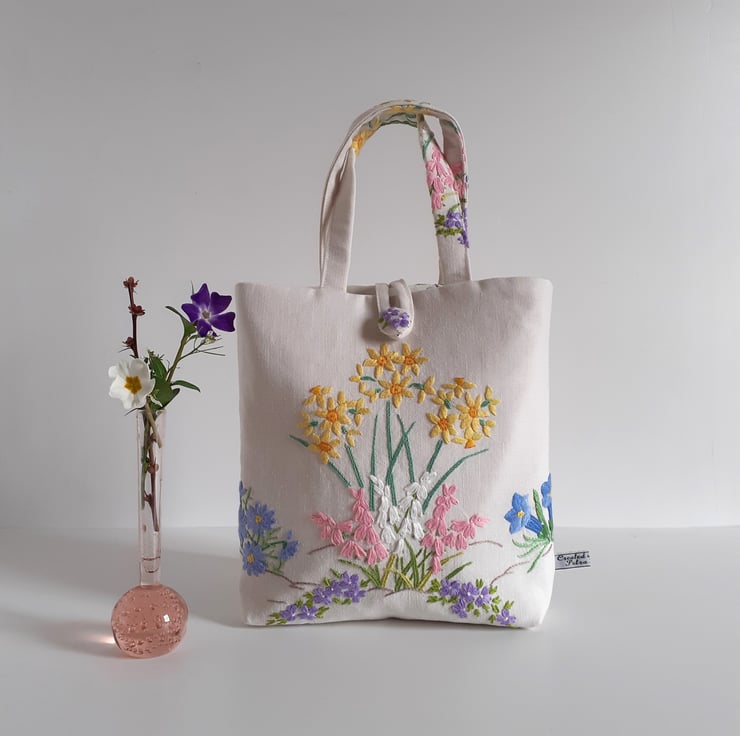 This pretty vintage embroidered cloth was just right to upcycle into a little bucket bag. It has a spray of embroidered flowers on the front, and a little sweep of vintage flowers across the back, decorated with 3 vintage buttons. Its two handles are long enough to fit snuggly around your hands, and although it is dinky, it is just large enough to hold your essentials at a wedding or garden party. This small hand bag has a decorative button and loop fastening, as well as a magnetic snap on the inside facing, and is like having an additional pocket, but with its own handles! Unashamedly nostalgic, it would make a lovely present for a vintage fabric lover, or as an accessory for a Spring time or vintage wedding.