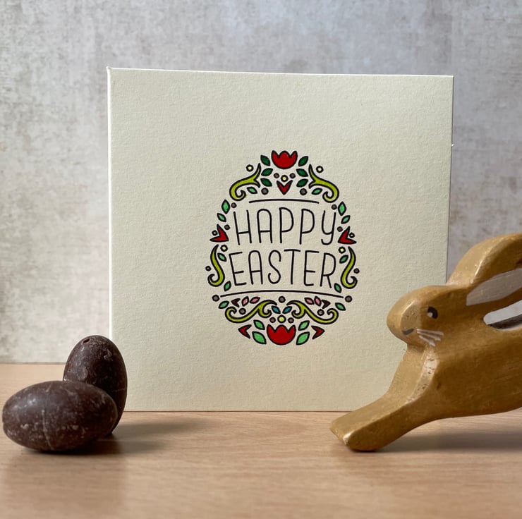 Full of spring colour, these lovely little cards are hand painted using watercolours and acrylics, with just the right amount of sparkle to catch your attention. The shapes are formed into the shape of an easter egg and have the words 'Happy Easter' on the inside of the egg. I've chosen reds and greens with a touch of pink, and the tiniest splash of irridescence to make this lovely seasonal card.