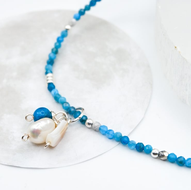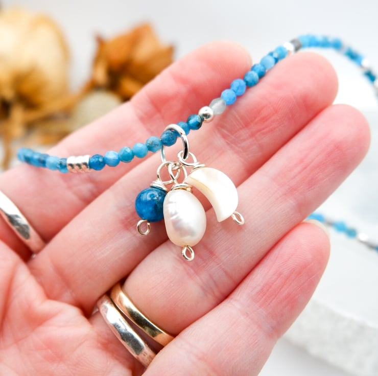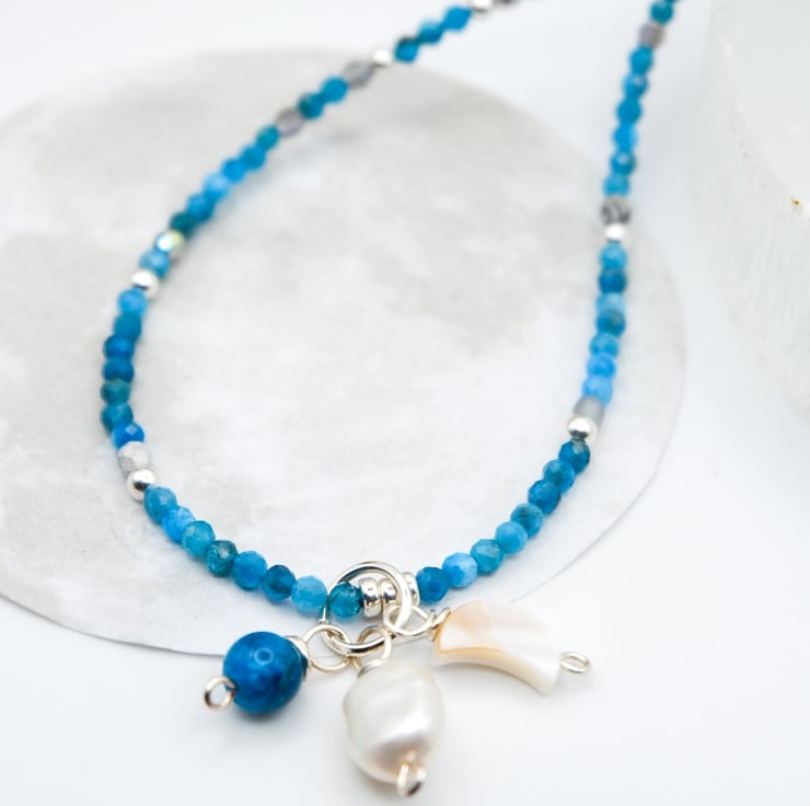 Handmade with lots of care, this one-of-a-kind necklace features: neon blue apatite faceted 3mm gemstone beads, sterling silver components - including round accent beads, beautiful faceted Czech glass accent beads in iridescent silver, freshwater baroque pearl, mother of pearl crescent moon, and apatite gemstone charms.