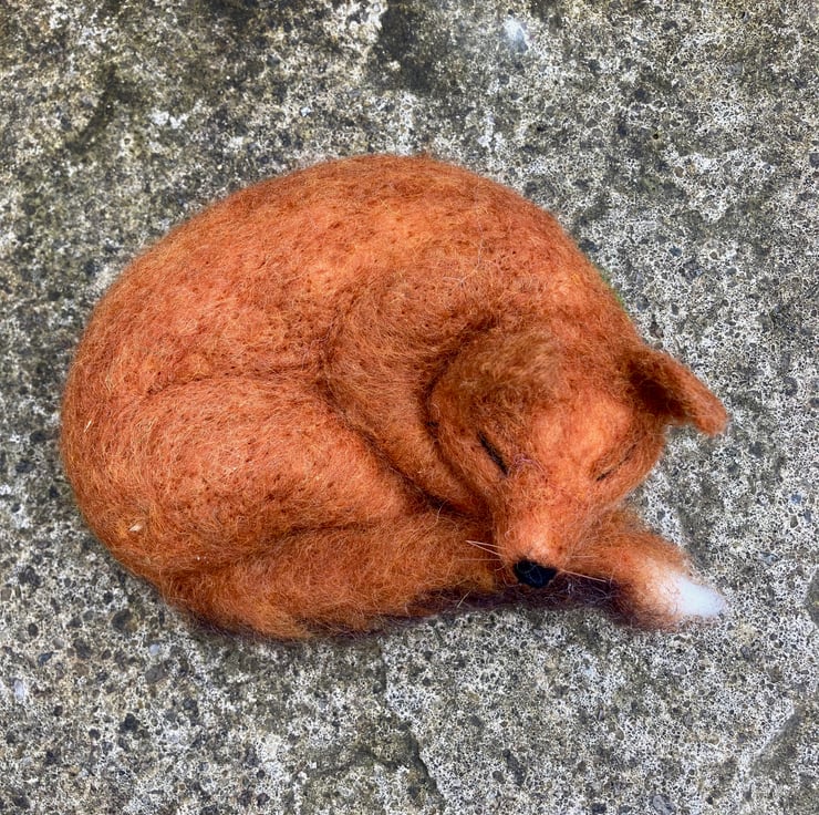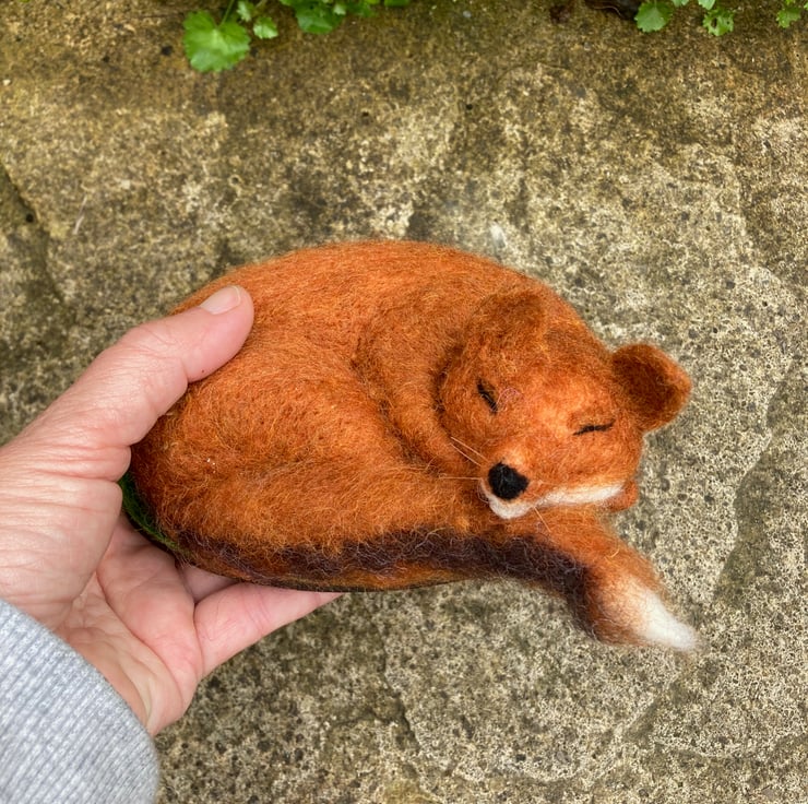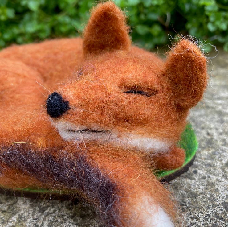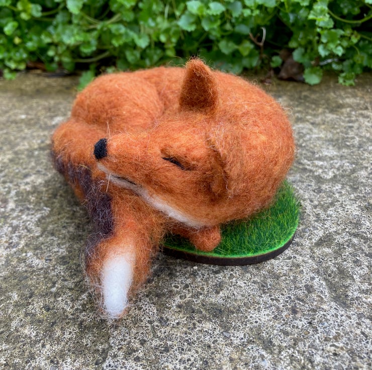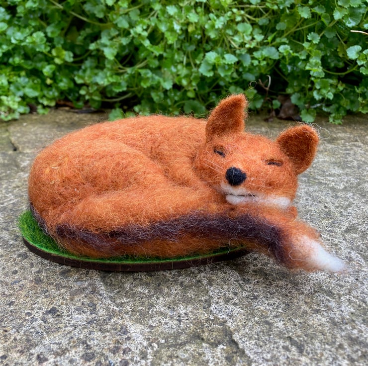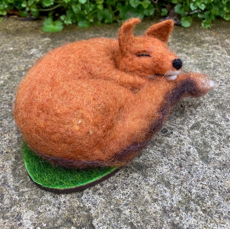 An adorable fox having a snooze. This sleeping fox has been sculpted with a needle felting technique using woollen fibres and a barbed felting needle. The basic shape has been formed using white woollen fibres and a fox coloured top coat added. His legs and bushy tail have been made over a wire former and attached to the body along with the ears. Horse hair whiskers have been added. The fox has then been mounted on a wooden oval covered in artificial grass.