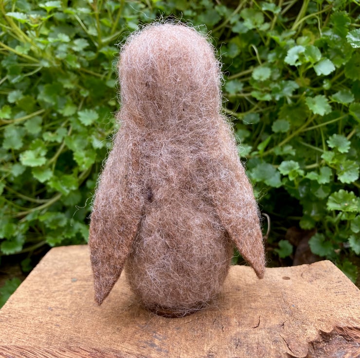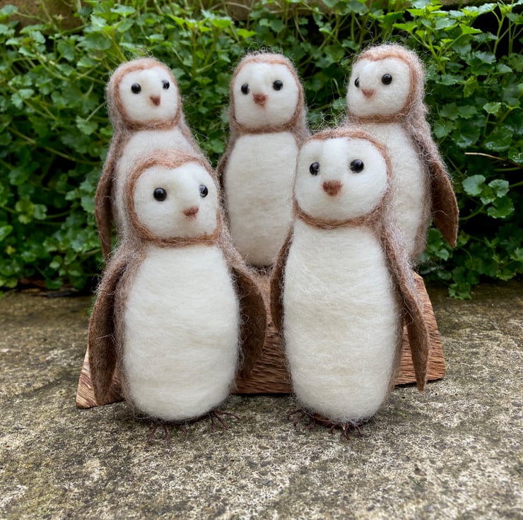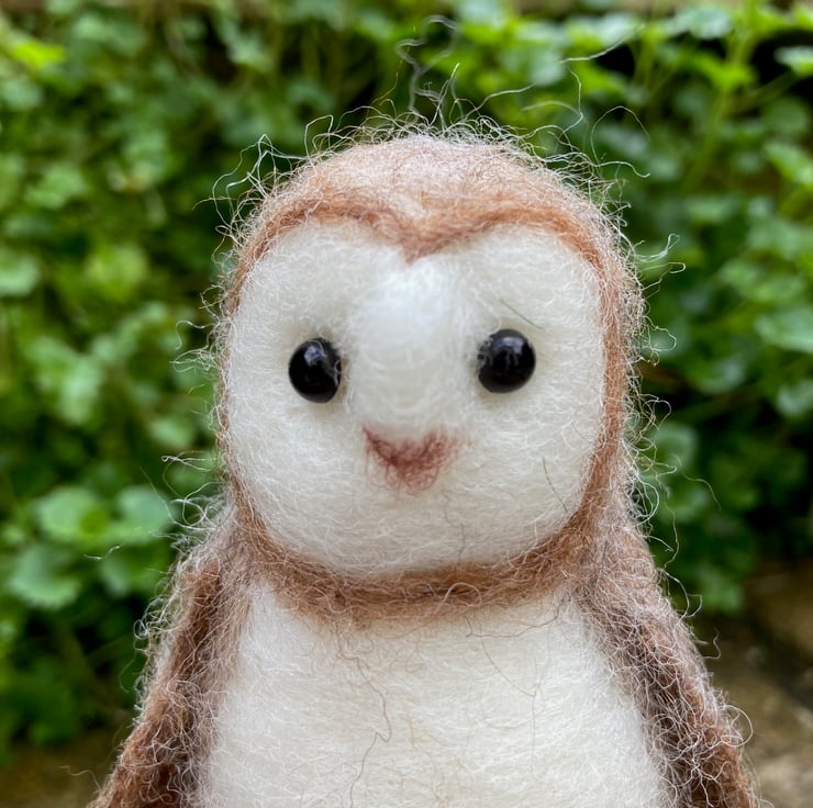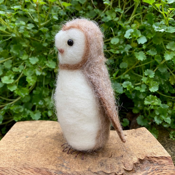 This listing is for a mini barn owl sculpted from woollen fibres using a needle felting technique. A barbed felting needle is used to bind the fibres together and sculpt them into shape. The barn owl has wired feet and beaded eyes and is mounted on a small wooden disc to aid stability. The owl measures approximately 10cm (4") tall