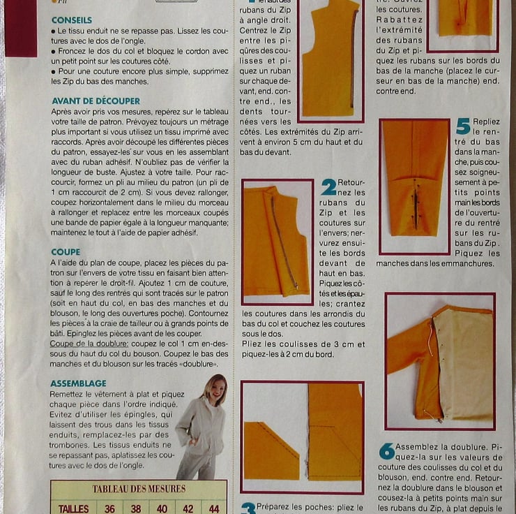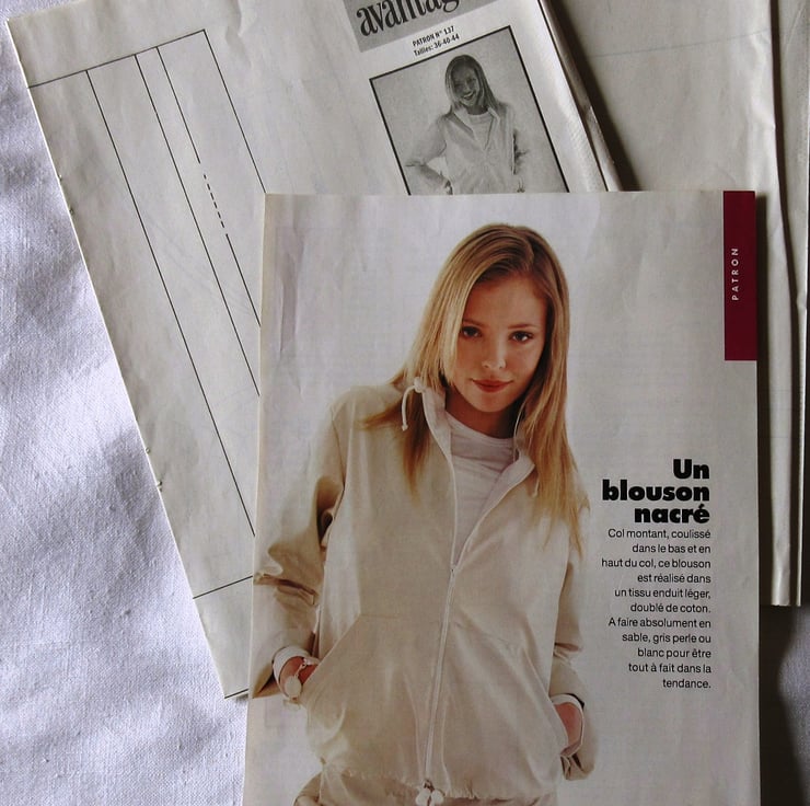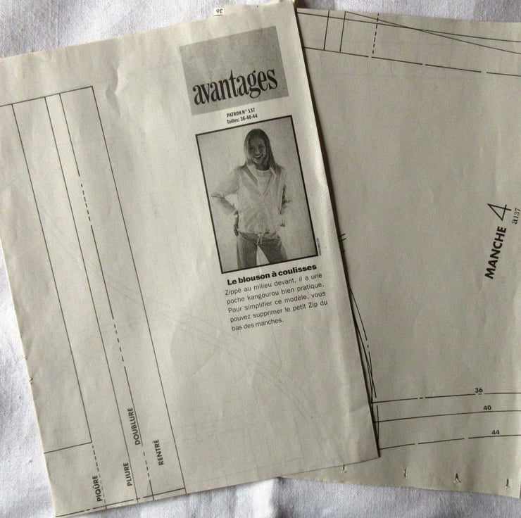 A French multi-size sewing pattern for a zipped blouson jacket or bomber jacket with a zip fastening, pockets and drawstrings at the bottom and at the neck. The pattern is from Avantages No 137, February 2000. The pattern pieces are printed on both sides of two sheets of paper and will need to be traced off before cutting. It is for European sizes 36, 40 and 44 (bust 32"/82 cm, 34"/88 cm and 38"/96 cm. All instructions are in French. The pattern is supplied in a clear plastic folder.