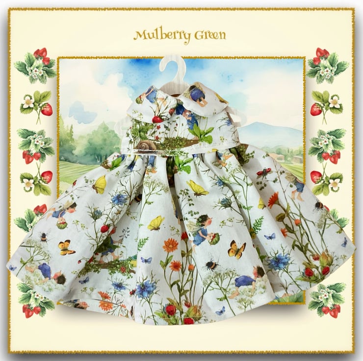 A beautiful little dress in a Daniela Drescher print, to fit the Mulberry Green characters. The dress is made from best quality designer cotton, has a full skirt and a lined bodice.