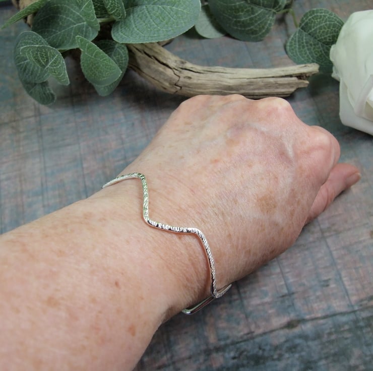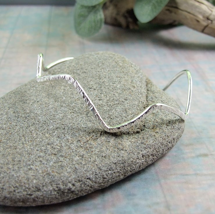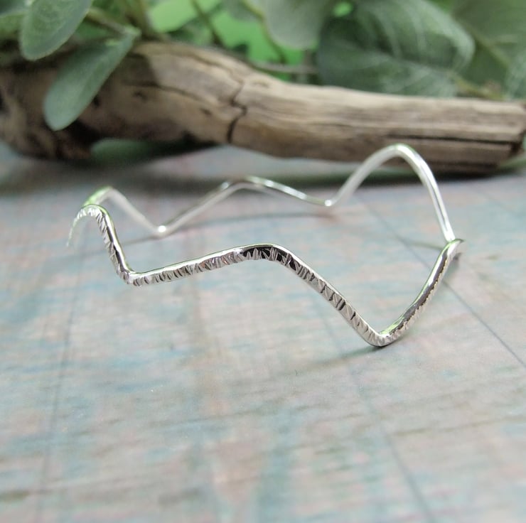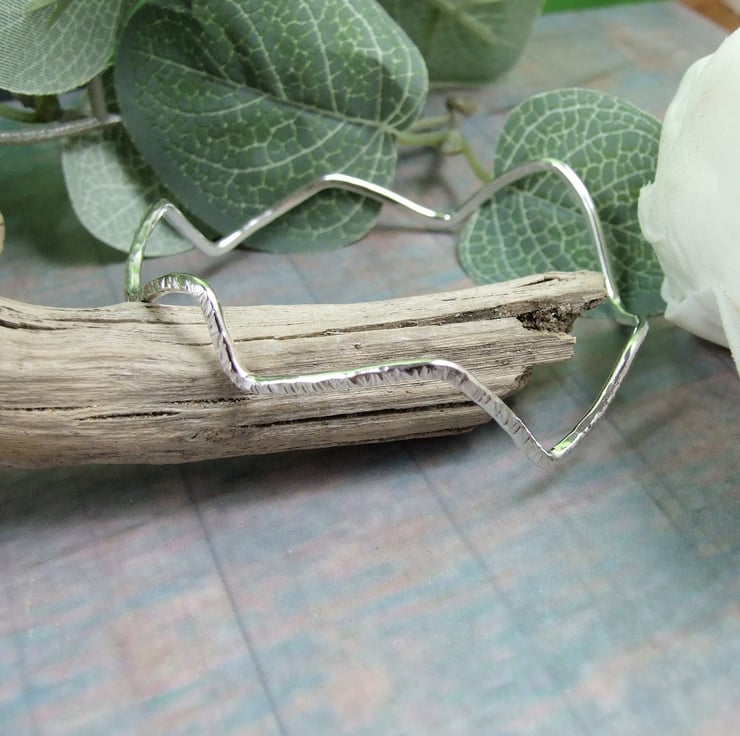 Hand forged Sterling Silver Bangle. Asymmtric Wave design to fit size medium 20cm circumference.