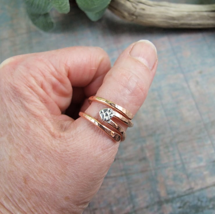 Made from 2mm round copper wire. I have shaped the wire into a 'u' and rounded the ends, flattening slightly. At the centre I have soldered a small sterling silver patterned heart element. This is made from my own recycled silver, melted and hammered into a steel die. Hammered texture finish.