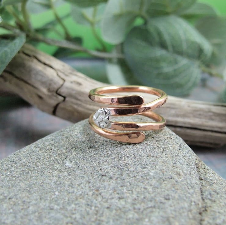 Hand Forged Copper double wrap around ring with sterling silver patterned heart accent. To fit UK size Q-S. Currently sized at UK R, please make a note during purchase if you wish the size altered to fit.